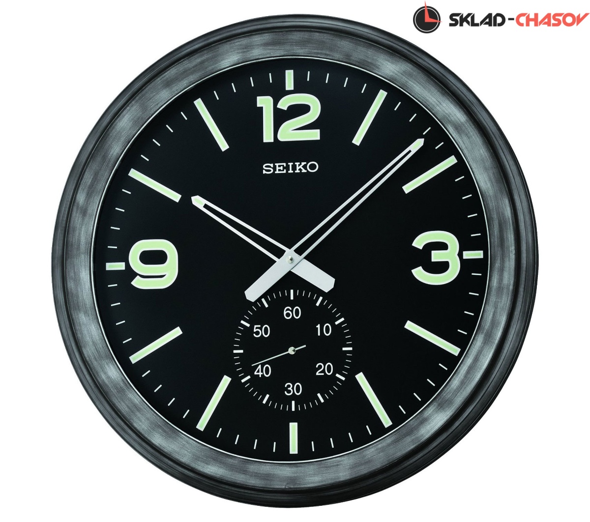 Секундная стрелка вынесена на отдельный циферблат. Требуются 2 батарейки AA (в комплекте). Тип механизма: кварцевый. Корпус: пластик. Циферблат: черный. Подсветка: люминесцентные стрелки и метки. Диаметр: 51см. Глубина: 5,7см.