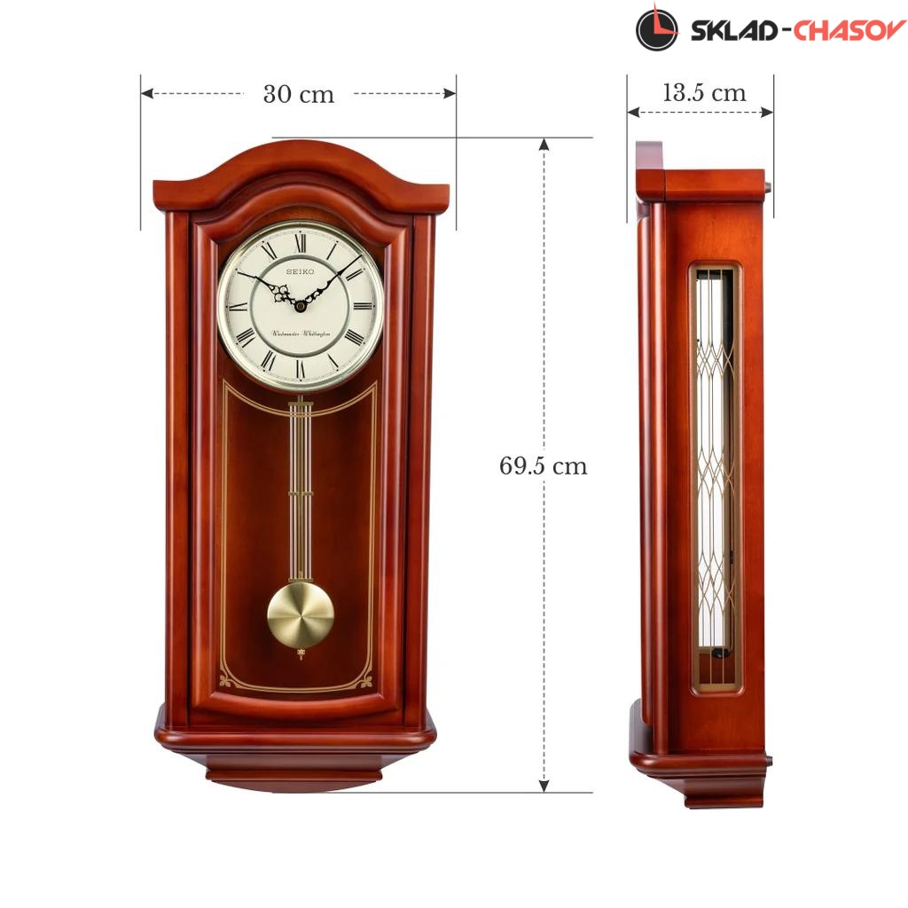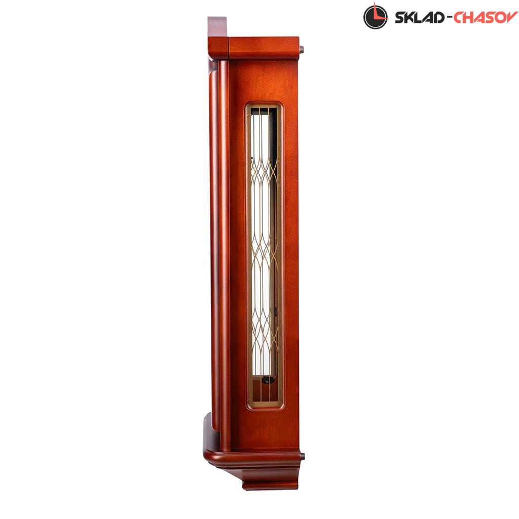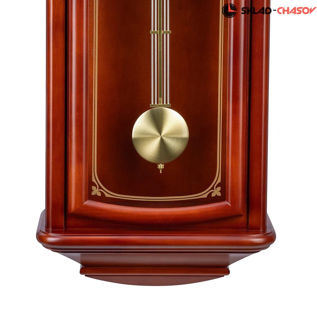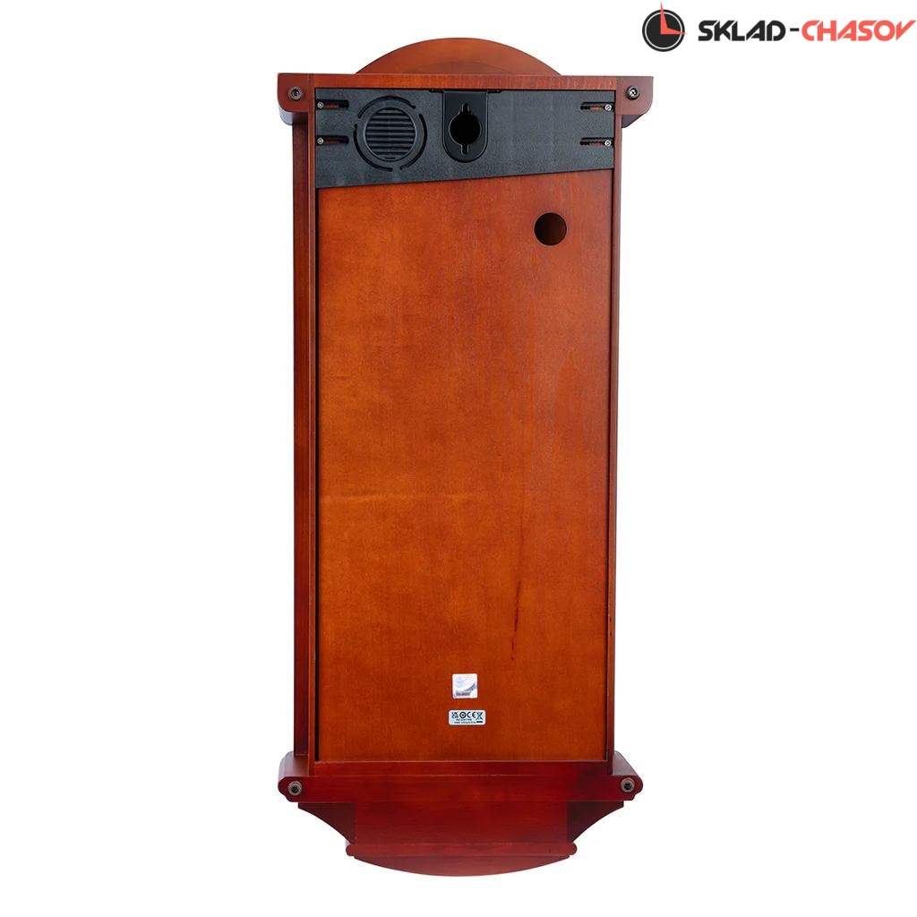 Коричневые кварцевые настенные часы с аналоговым циферблатом (стрелки). Стрелки: черная часовая, черная минутная. Бежевый циферблат с черными римскими цифрами. Циферблат закрыт стеклом. Ниже циферблата расположился маятник золотистого цвета. Две мелодии на выбор Westminster/Whittington. Бой каждые 15 минут по четвертям. Ровно в час полная мелодия и бой по количеству часов. Регулятор громкости. Автоматическое отключение звука на ночь с 23.00 до 5.45. Корпус выполнен из дерева. Бесшумный механизм.