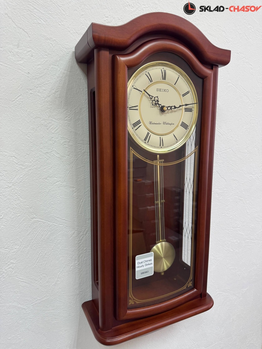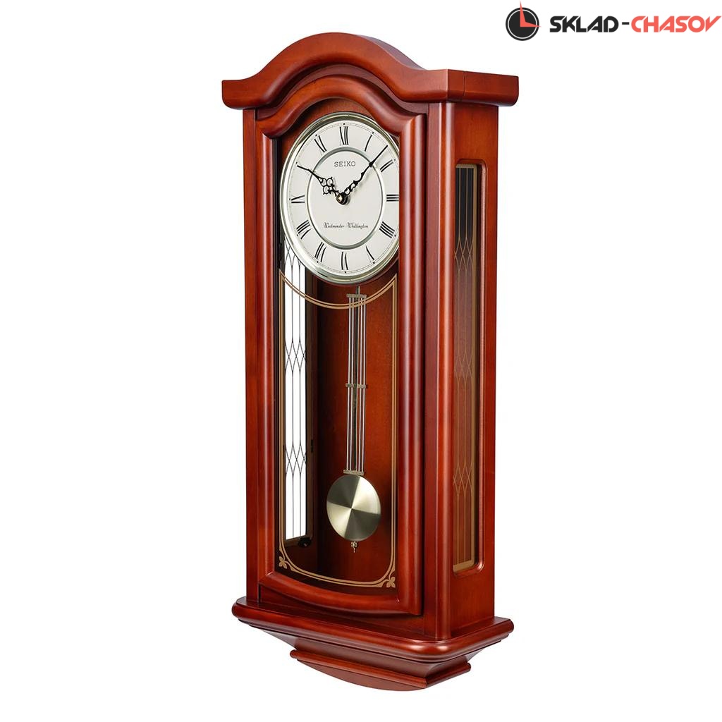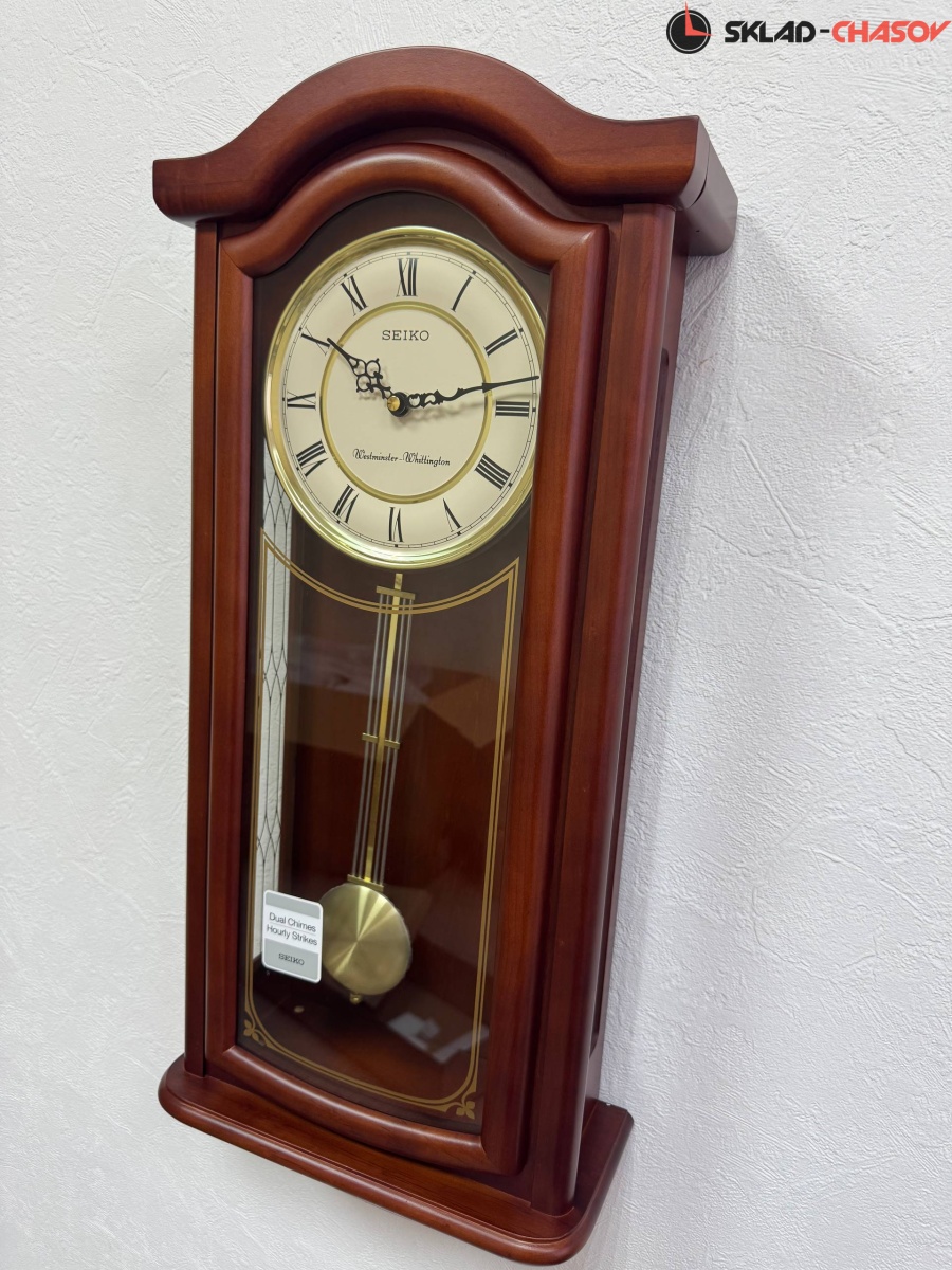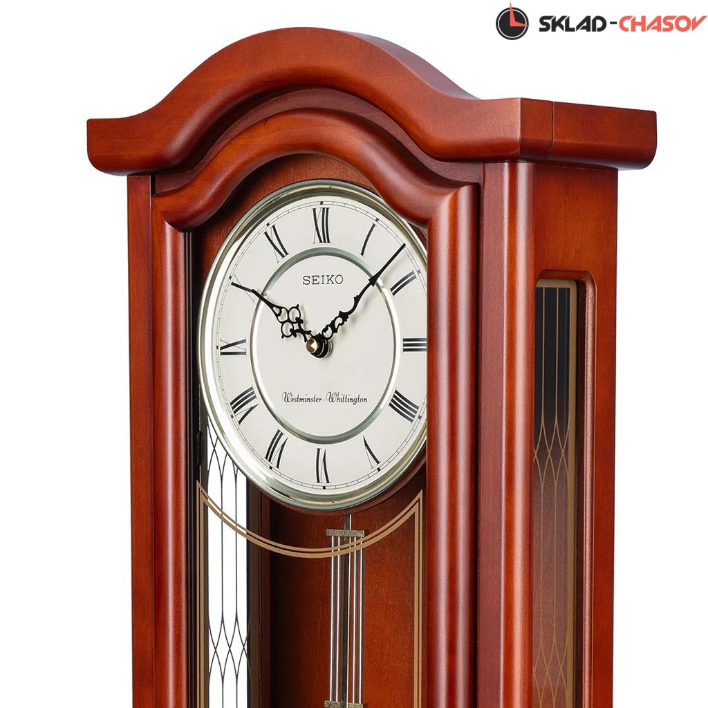 Коричневые кварцевые настенные часы с аналоговым циферблатом (стрелки). Стрелки: черная часовая, черная минутная. Бежевый циферблат с черными римскими цифрами. Циферблат закрыт стеклом. Ниже циферблата расположился маятник золотистого цвета. Две мелодии на выбор Westminster/Whittington. Бой каждые 15 минут по четвертям. Ровно в час полная мелодия и бой по количеству часов. Регулятор громкости. Автоматическое отключение звука на ночь с 23.00 до 5.45. Корпус выполнен из дерева. Бесшумный механизм.