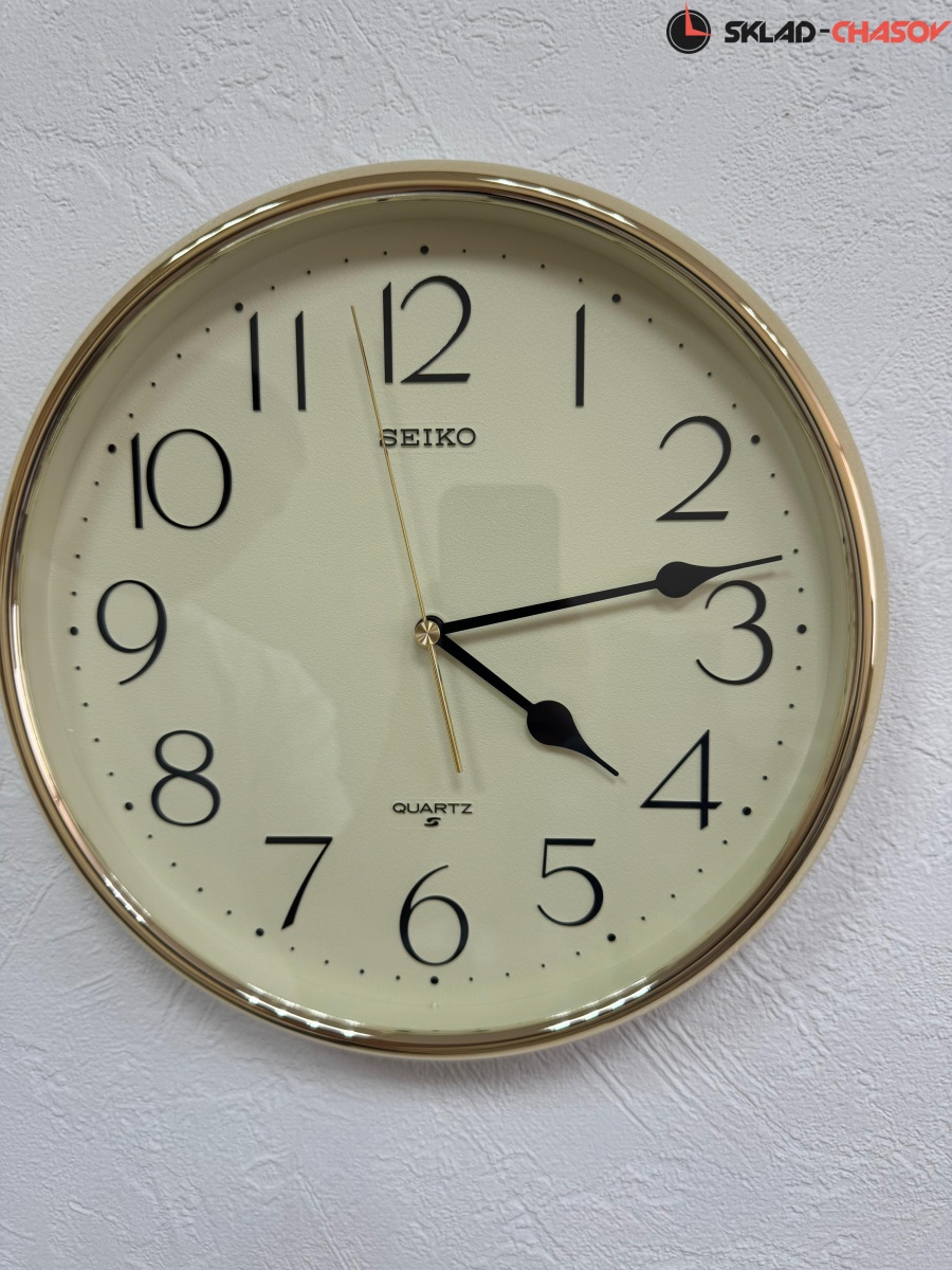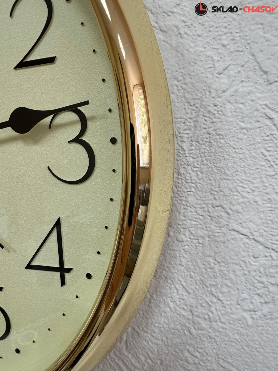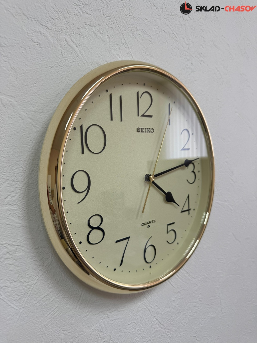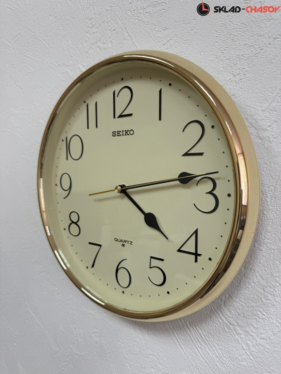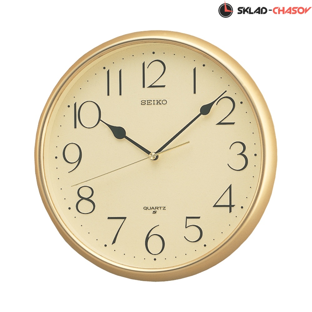 Лаконичные кварцевые настенные часы от Seiko (Япония) с аналоговым циферблатом (стрелки). Стрелки: черная часовая, черная минутная и золотистая секундная. На циферблате хорошо читаются чёрные арабские цифры. Часы оснащены надёжным дискретным механизмом с тихим ходом секундной стрелки. Корпус выполнен в золотистом цвете из пластика.