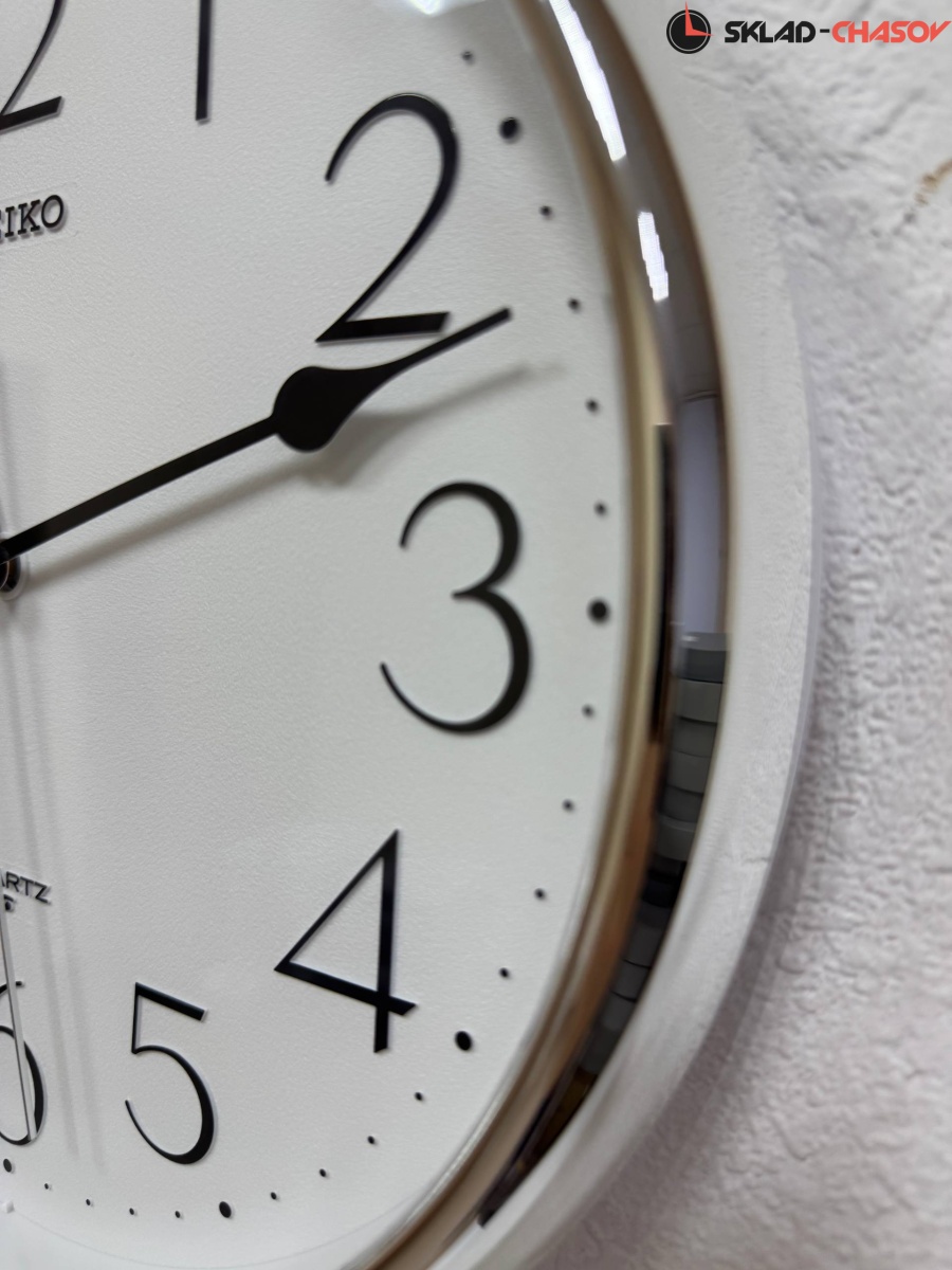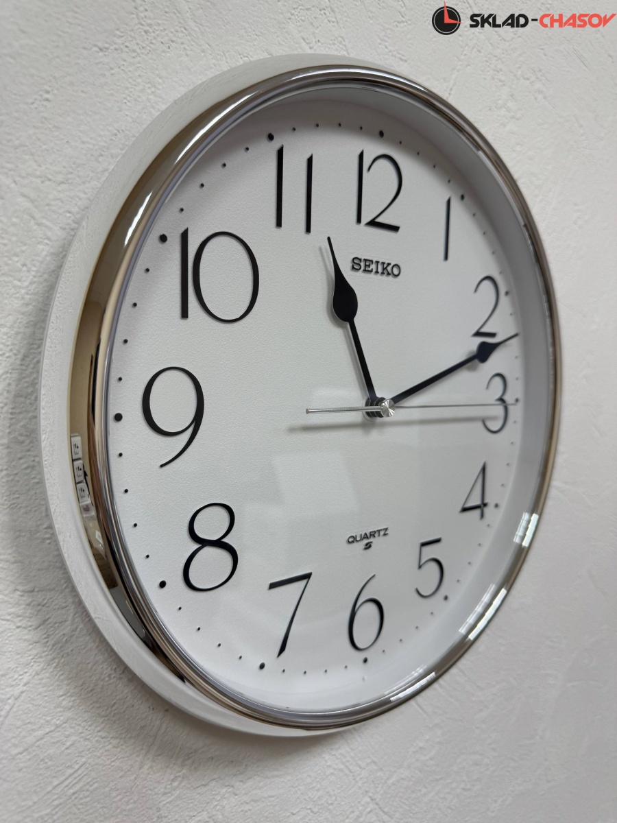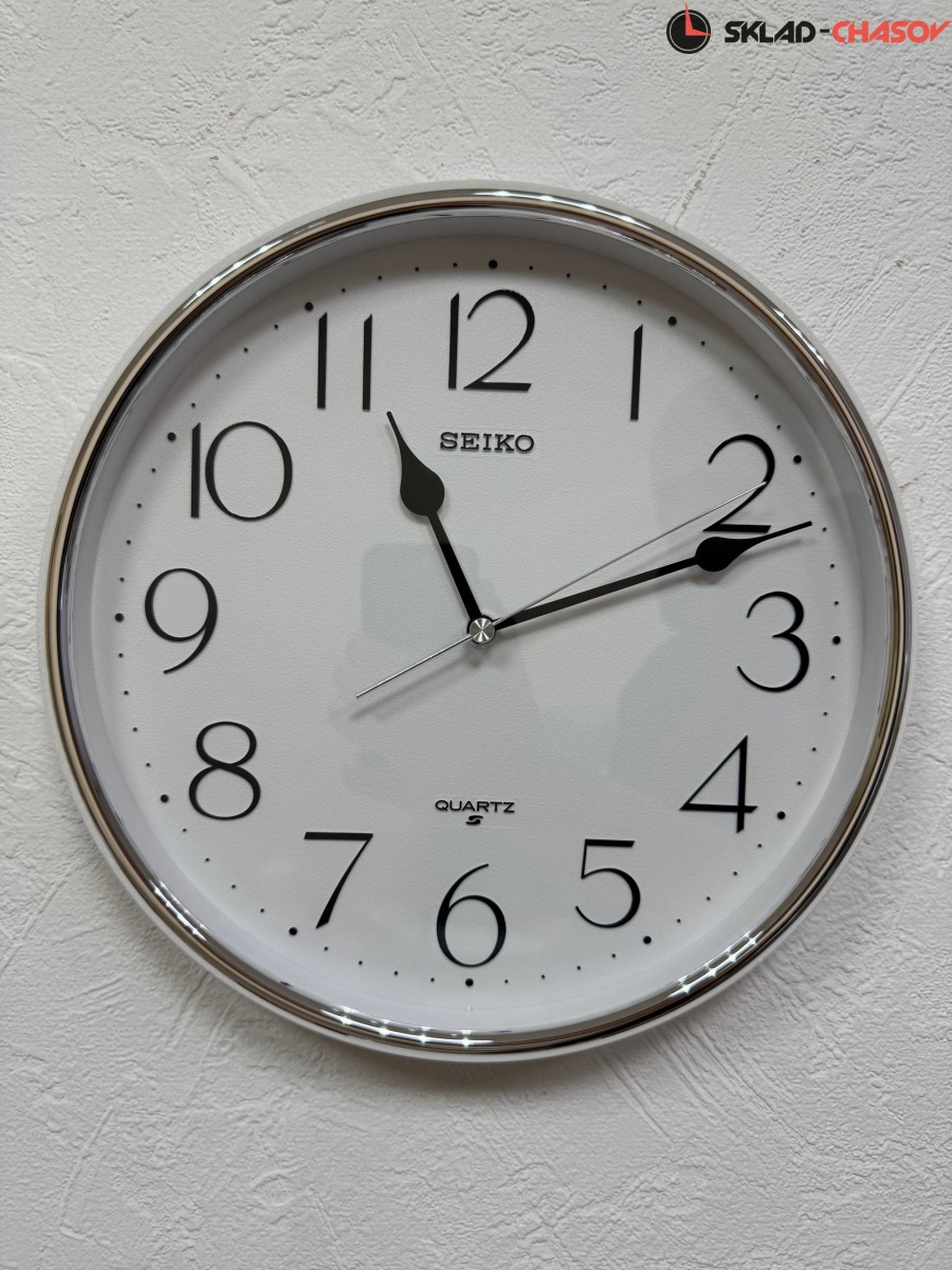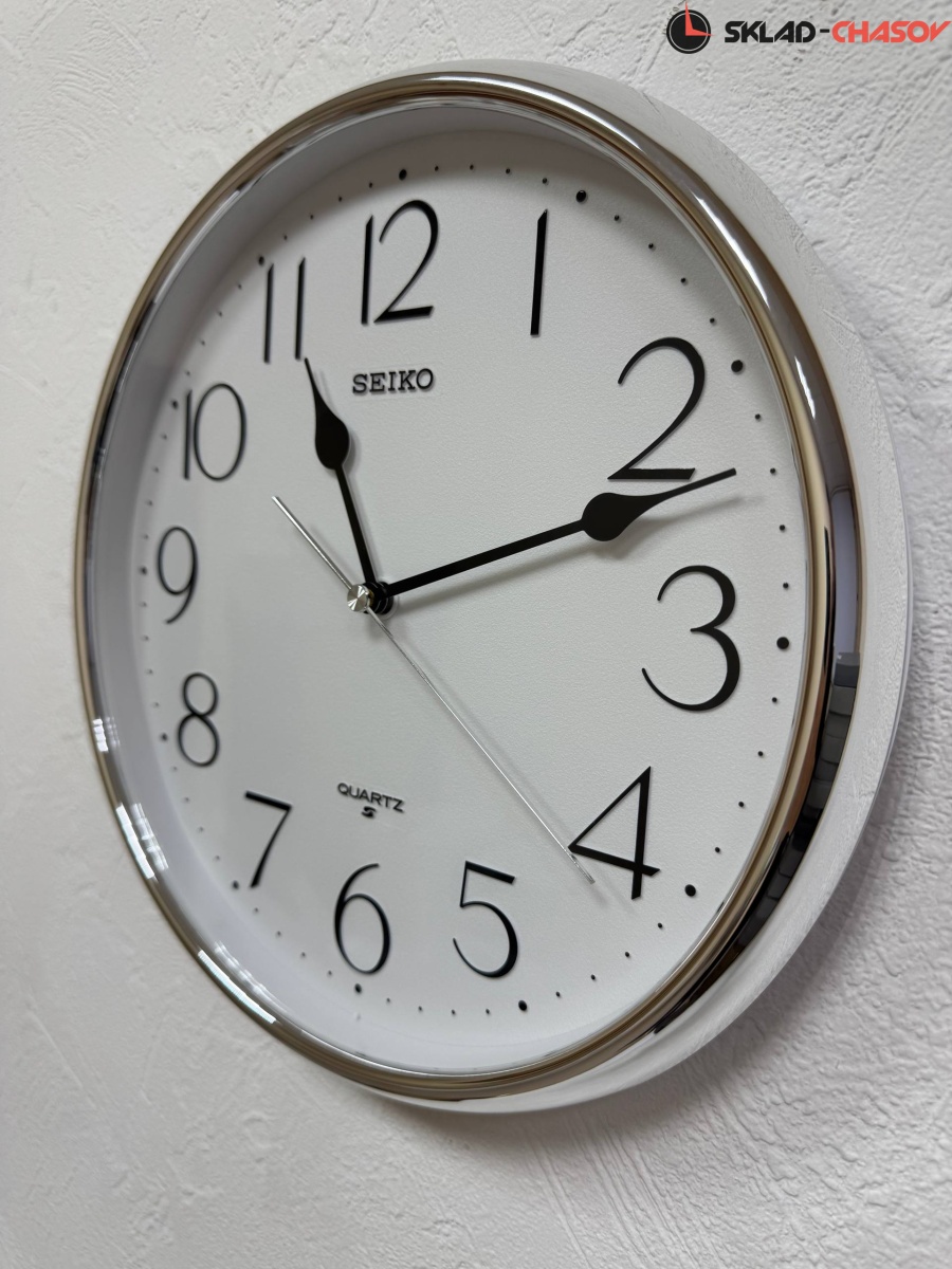 Серебристые настенные кварцевые часы с аналоговым циферблатом (стрелки). Стрелки: черная часовая, черная минутная и серебристая секундная. Белый циферблат с объёмными арабскими цифрами в черном цвете. Корпус выполнен из пластика.
