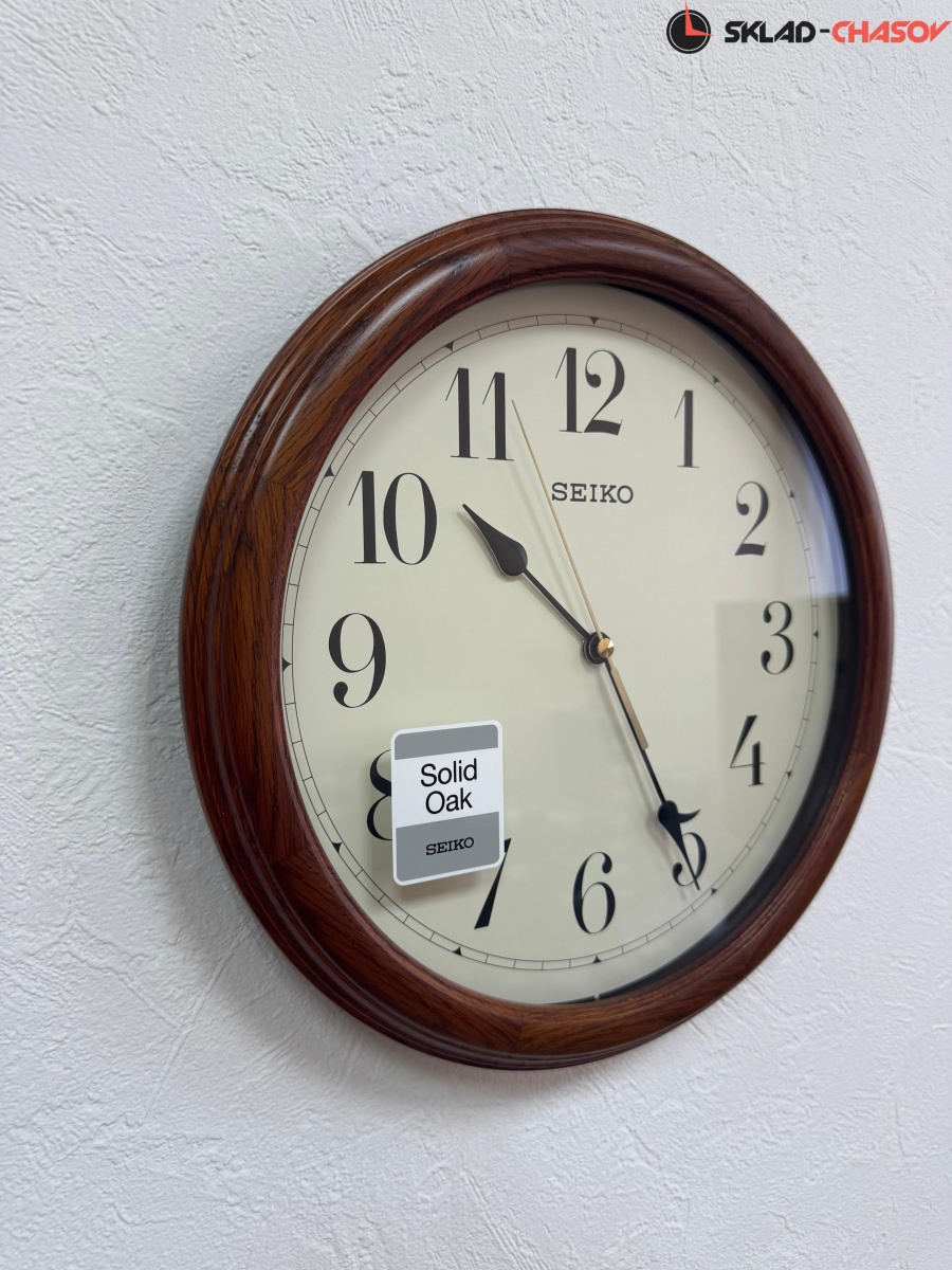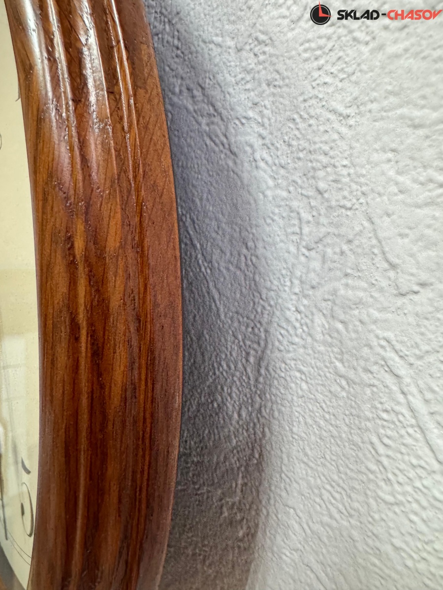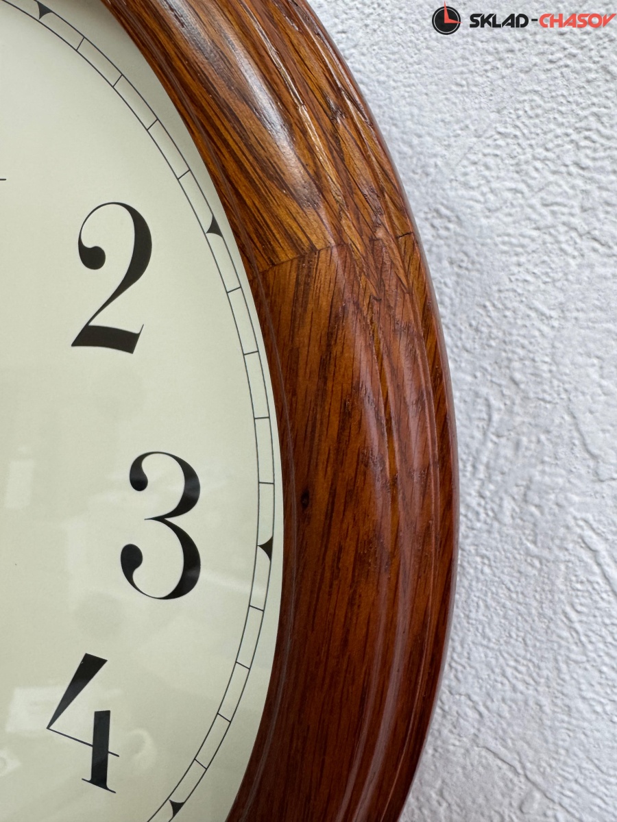 Коричневые настенные кварцевые часы с аналоговым циферблатом (стрелки). Стрелки: черная часовая, черная минутная и золотистая секундная. Бежевый циферблат с арабскими цифрами, закрыт стеклом. Стекло минеральное, устойчивое к возникновению царапин. Корпус выполнен из массива дуба.