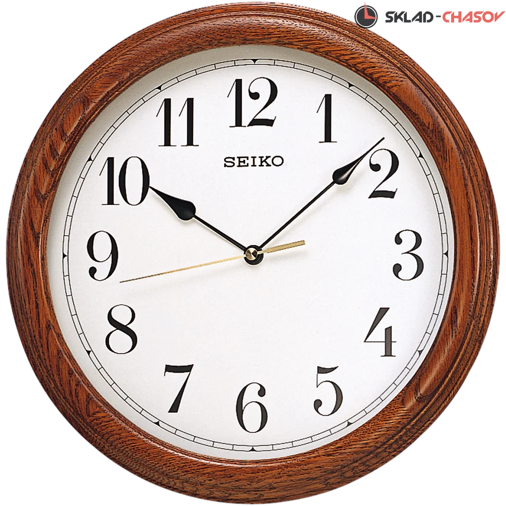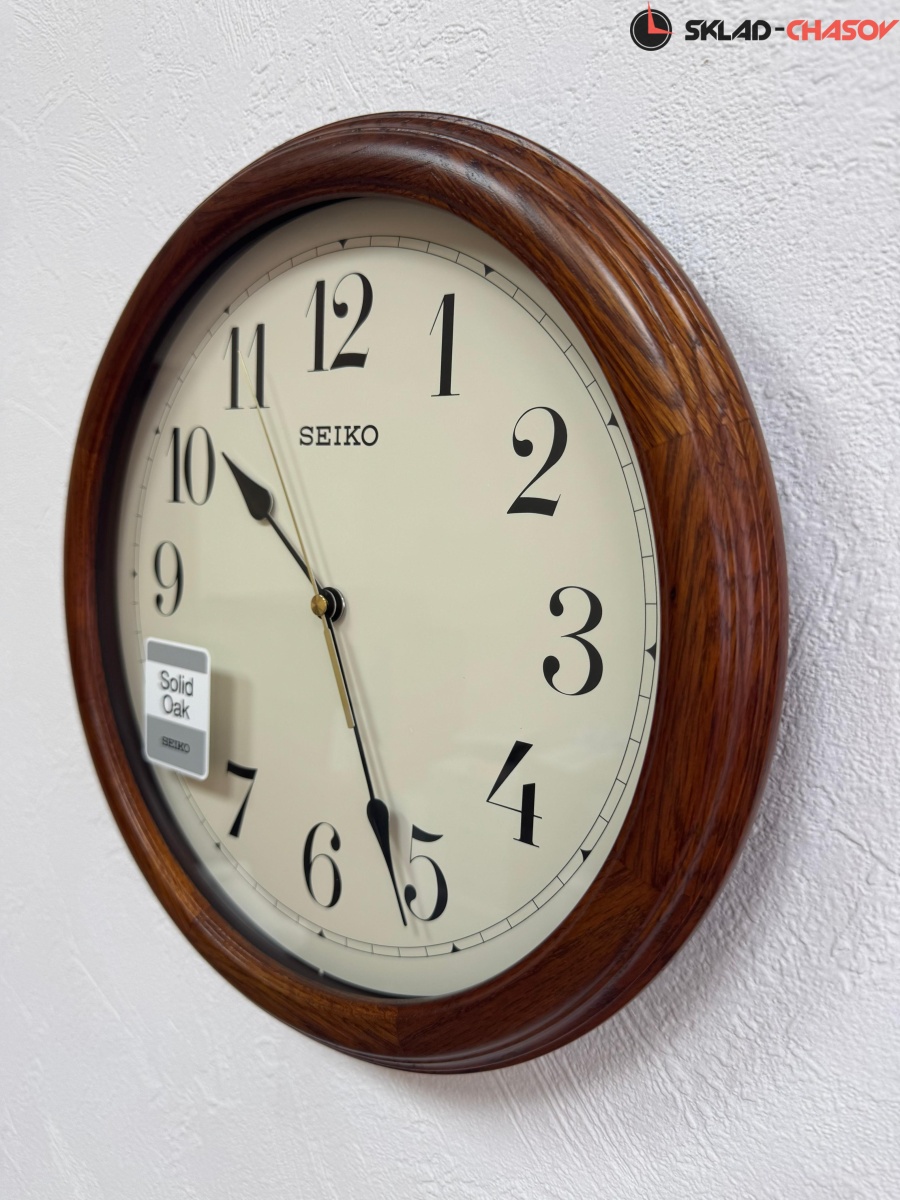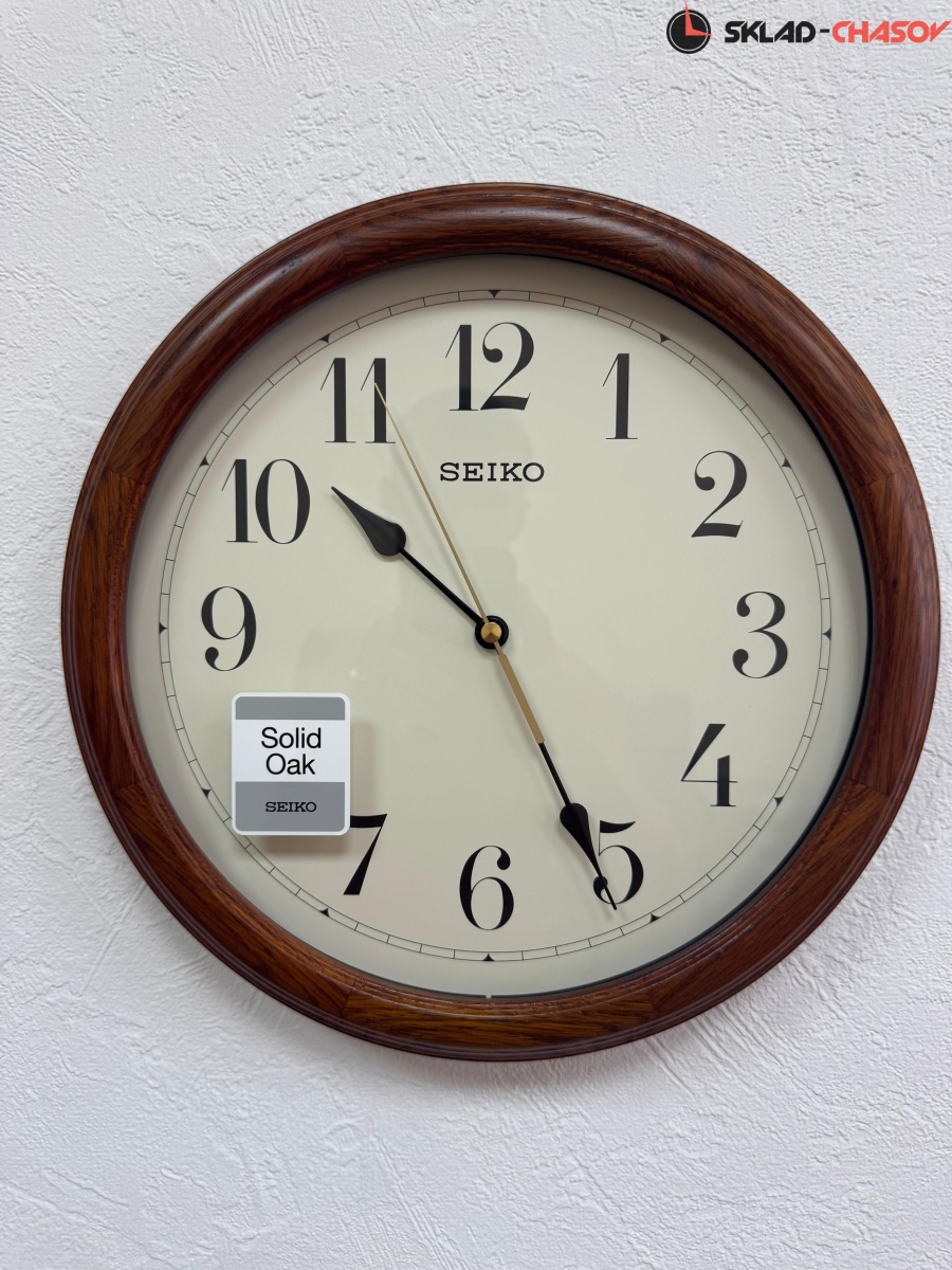 Коричневые настенные кварцевые часы с аналоговым циферблатом (стрелки). Стрелки: черная часовая, черная минутная и золотистая секундная. Бежевый циферблат с арабскими цифрами, закрыт стеклом. Стекло минеральное, устойчивое к возникновению царапин. Корпус выполнен из массива дуба.