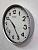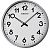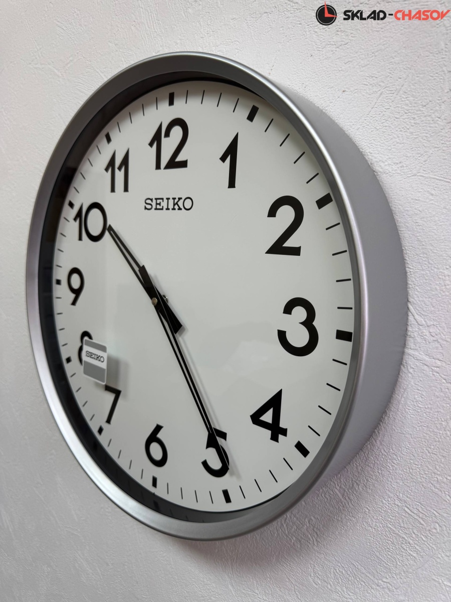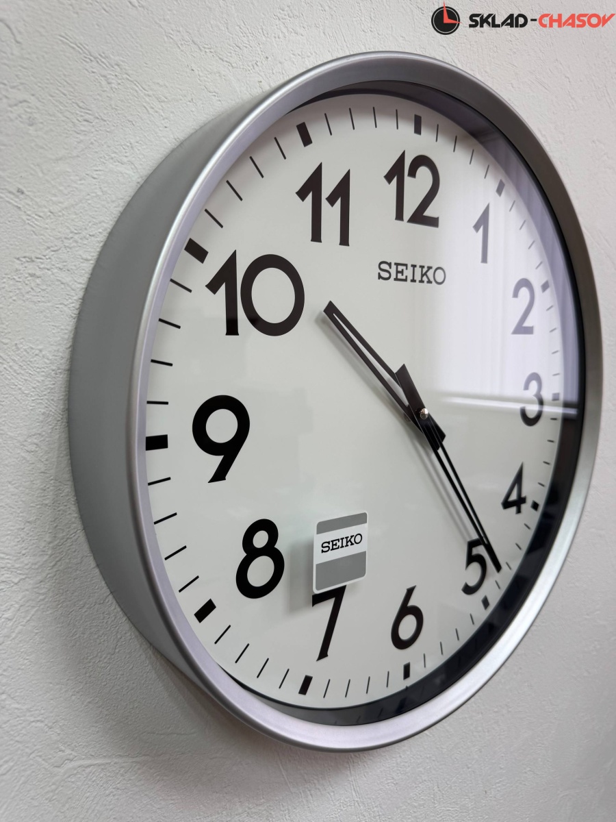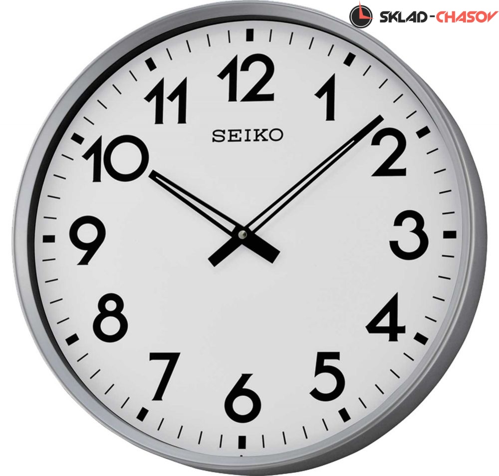 Серебристые настенные кварцевые часы с аналоговым циферблатом (стрелки). Стрелки: черная часовая и черная минутная. На белом циферблате черные арабские цифры. Корпус выполнен из пластика.