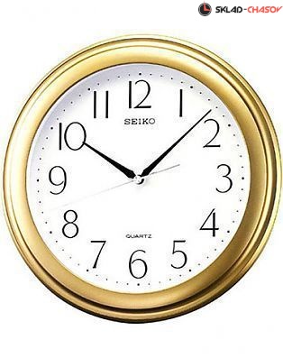 Стильные настенные часы в круглом пластиковом корпусе золотистого цвета. Белый циферблат с арабскими цифрами и серебристой секундной стрелкой.