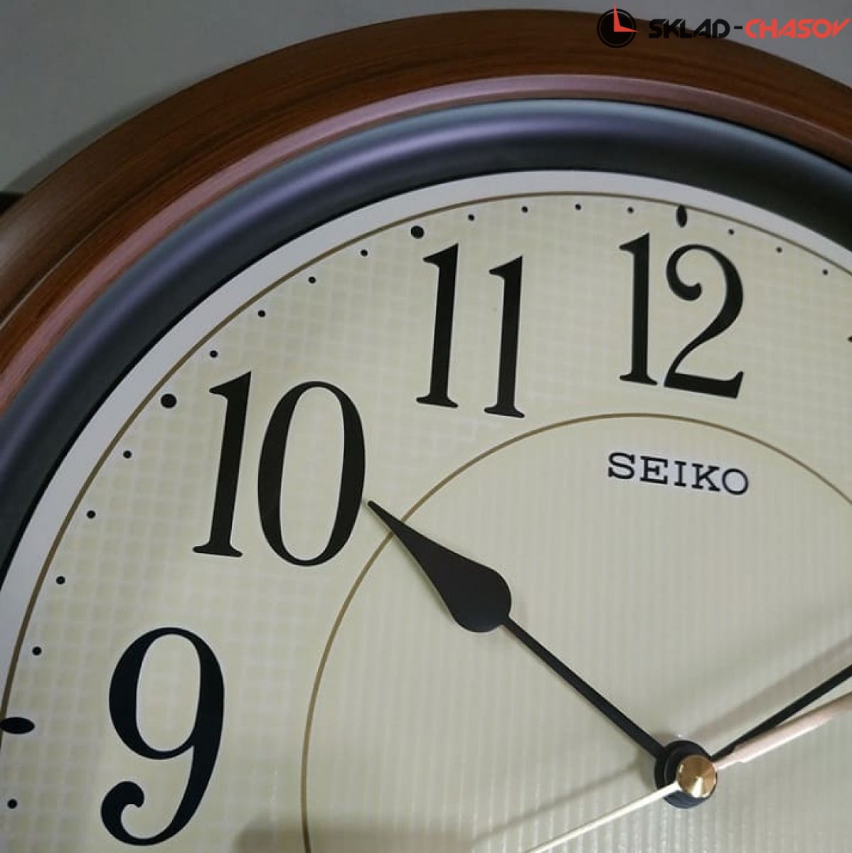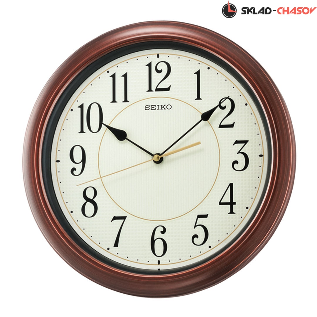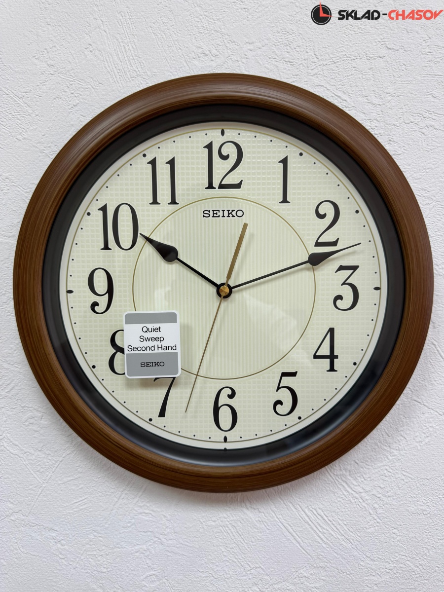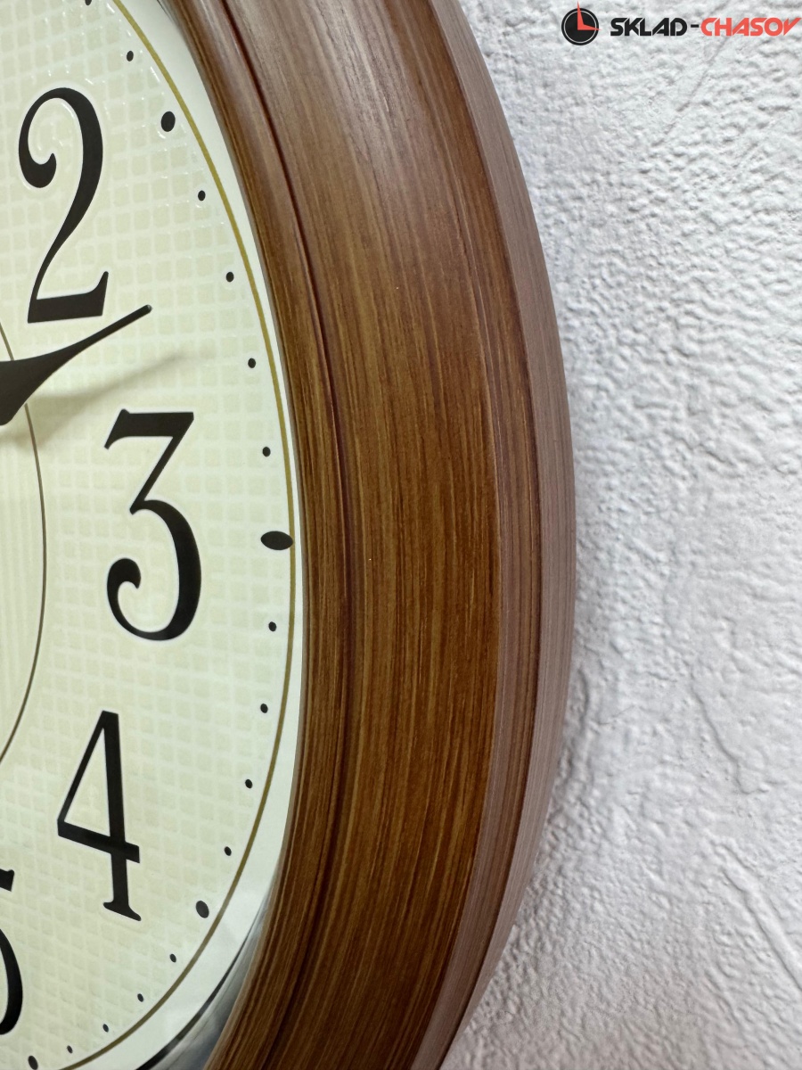 Коричневые настенные кварцевые часы с аналоговым циферблатом (стрелки). Стрелки: черная часовая, черная минутная и золотистая секундная. Бежевый циферблат с арабскими цифрами оснащен люминесцентной подсветкой LumiBrite, что позволит видеть время в темное время суток. Плавный ход секундной стрелки. Бесшумный механизм. Корпус выполнен из пластика под дерево.