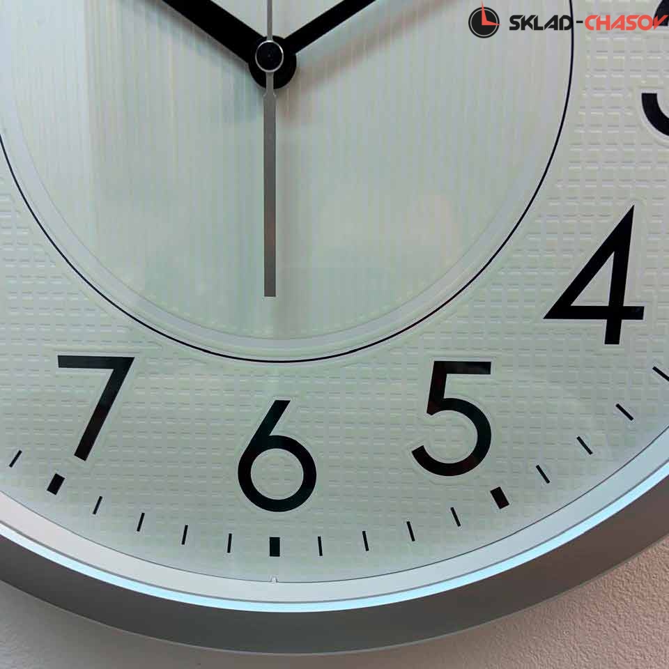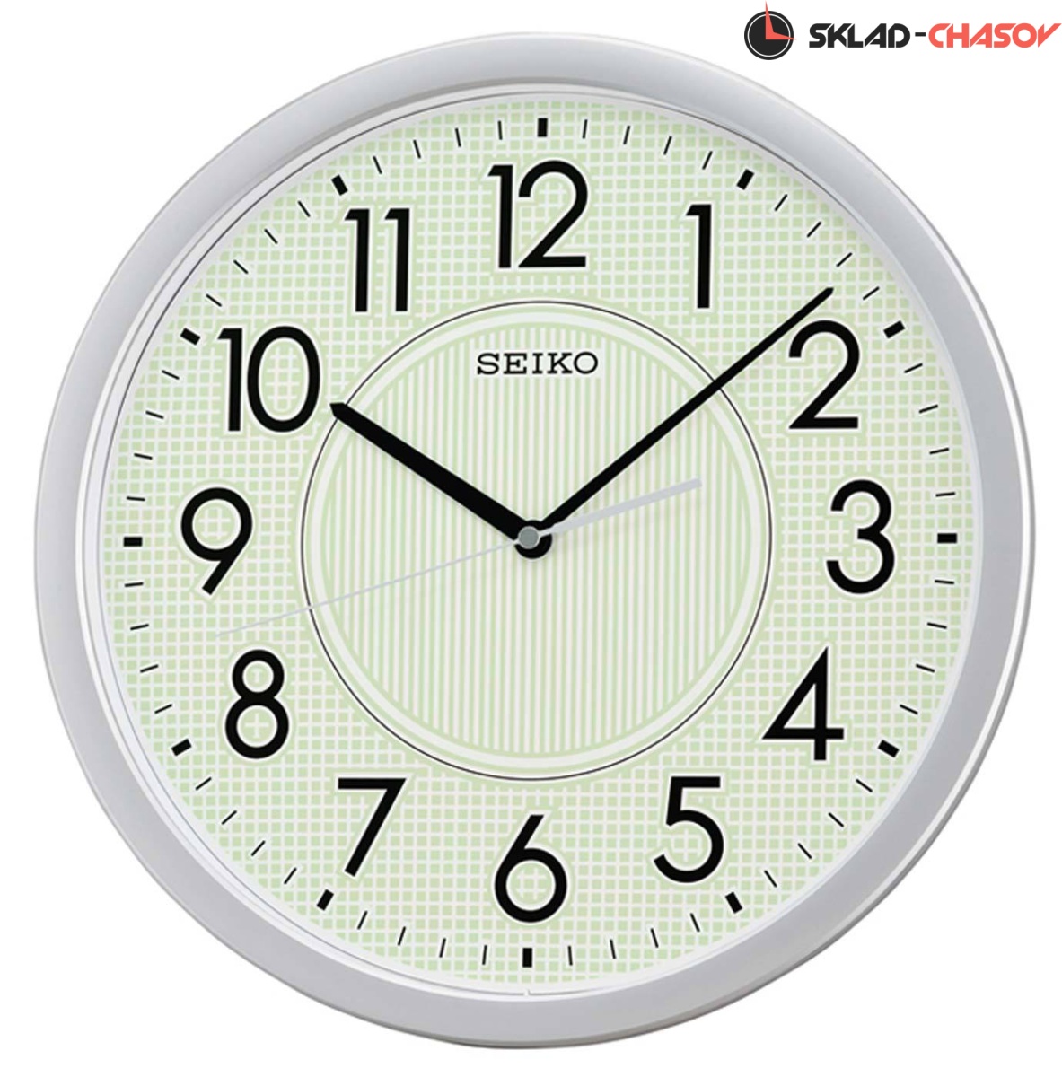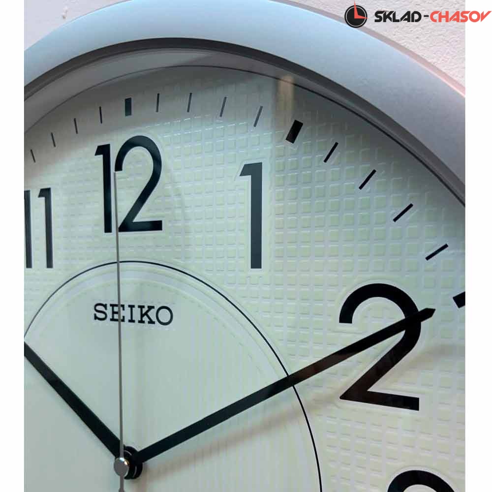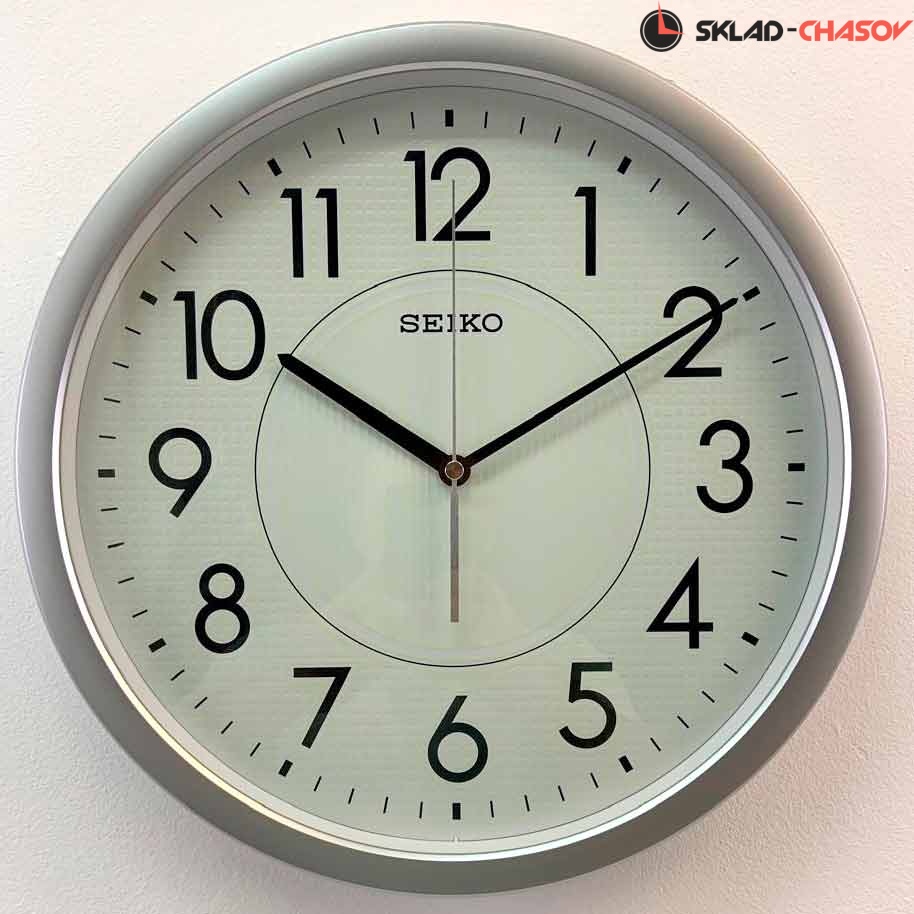 Кварцевые настенные часы Seiko в круглом серебристом корпусе с аналоговым циферблатом (стрелки). Стрелки: черная часовая, черная минутная и серебристая секундная. Циферблат с люминесцентной подсветкой LumiBrite, что позволит видеть время в темное время суток. Бесшумное и плавное движение секундной стрелки.