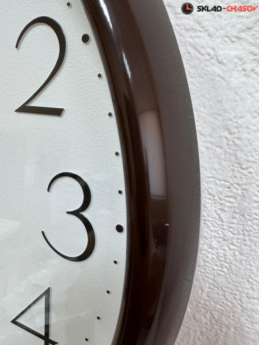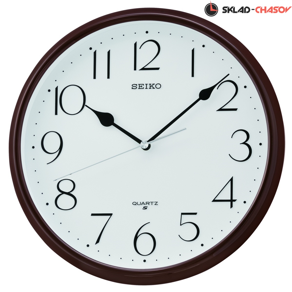Лаконичные кварцевые настенные часы от Seiko (Япония) с аналоговым циферблатом (стрелки). Стрелки: черная часовая, черная минутная и серебристая секундная. На белом циферблате хорошо читаются чёрные арабские цифры. Часы оснащены надёжным дискретным механизмом с тихим ходом секундной стрелки. Корпус выполнен в коричневом цвете из пластика.