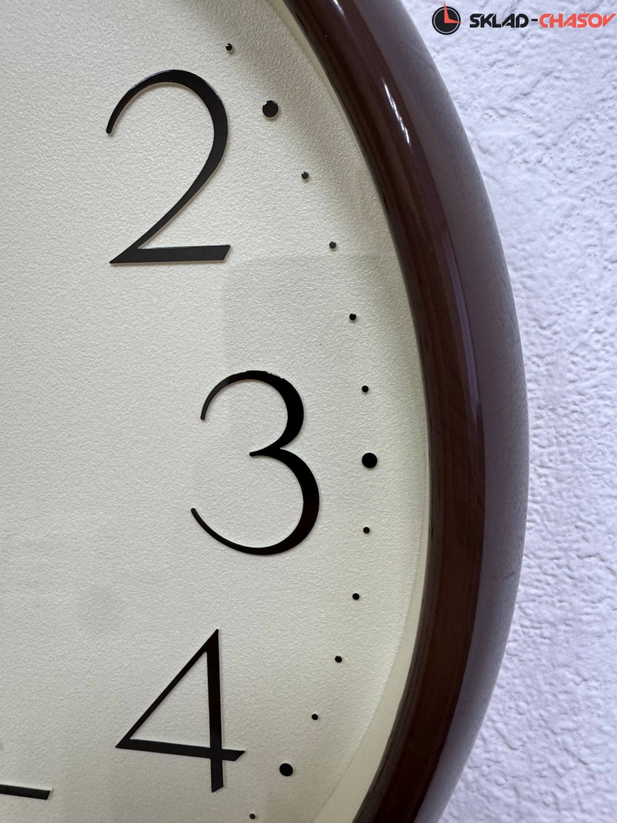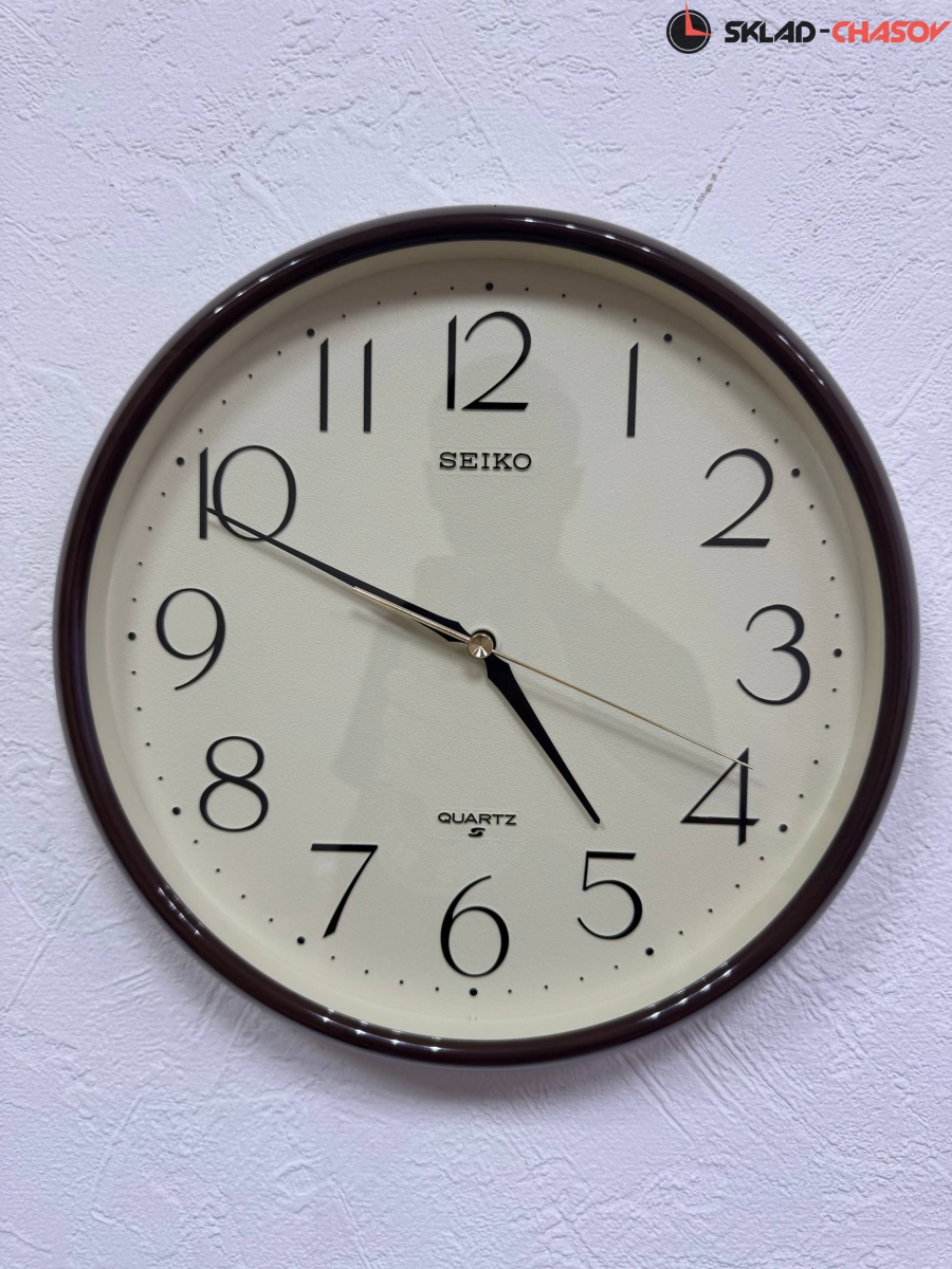 Лаконичные кварцевые настенные часы от Seiko (Япония) с аналоговым циферблатом (стрелки). Стрелки: черная часовая, черная минутная и золотистая секундная. На бежевом циферблате хорошо читаются чёрные арабские цифры. Цифры объемные. Часы оснащены надёжным дискретным механизмом с тихим ходом секундной стрелки. Корпус выполнен в коричневом цвете из пластика.