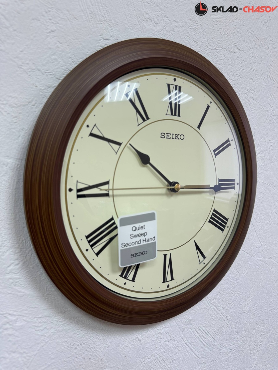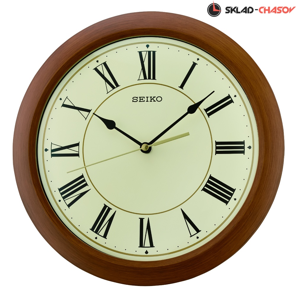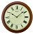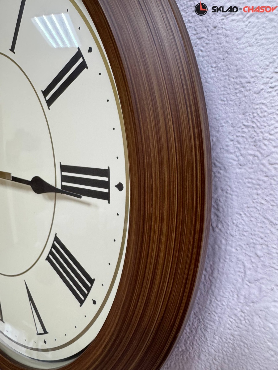 Коричневые кварцевые настенные часы с аналоговым циферблатом (стрелки). Стрелки: черная часовая, черная минутная и золотистая секундная. Пластиковый корпус с отделкой под дерево. Плавный ход секундной стрелки. Бесшумный механизм. Диаметр корпуса 30см, толщина 4,5 см.
