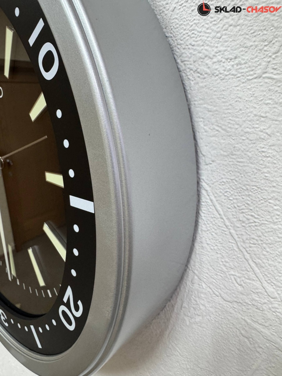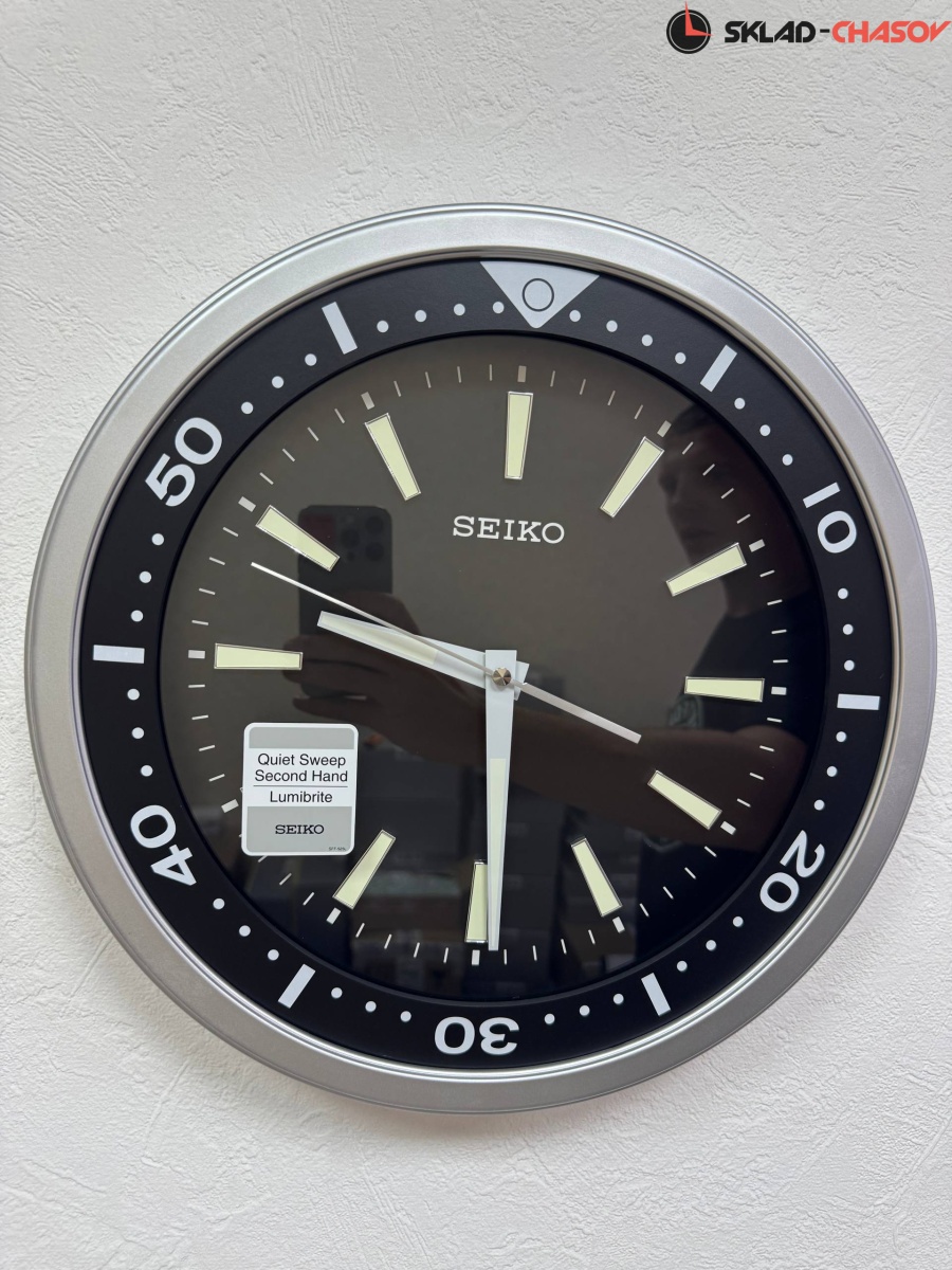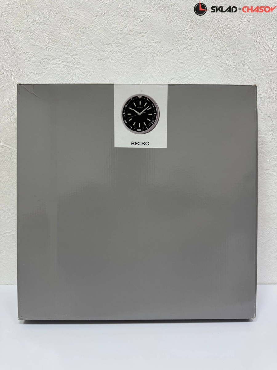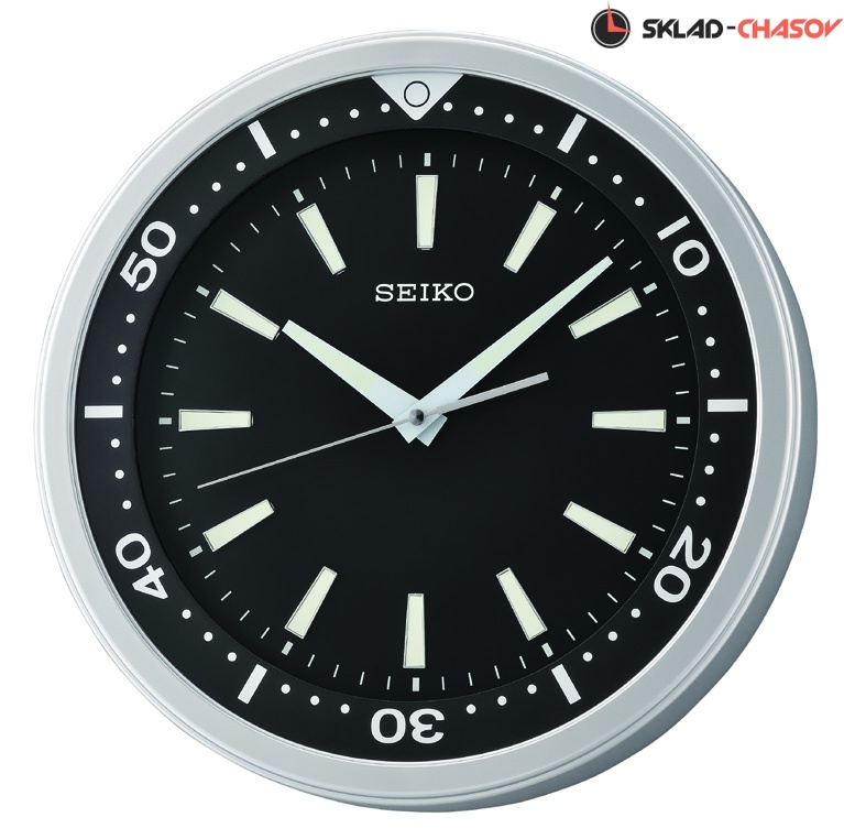 Кварцевые настенные часы Seiko в круглом серебристом корпусе с аналоговым циферблатом (стрелки). Корпус выполнен из пластика. Стрелки: серебристая часовая, серебристая минутная с нанесением люминесцентного покрытия и серебристая секундная. Циферблат черного цвета. Временные рамки обозначены большими визирами (черточками) с люминесцентным покрытием (светятся в темноте в течении нескольких часов). Бесшумное и плавное движение секундной стрелки.