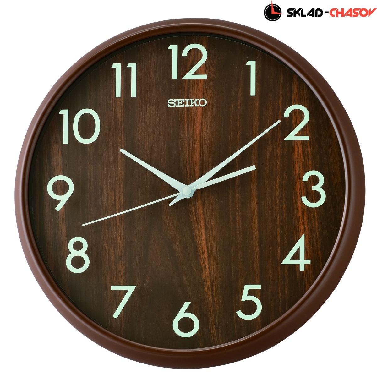 Коричневые настенные кварцевые часы с аналоговым циферблатом (стрелки). Циферблат под дерево с арабскими цифрами, закрыт стеклом. Плавный ход секундной стрелки. Бесшумный механизм. Корпус выполнен из пластика.