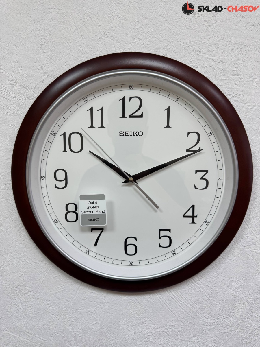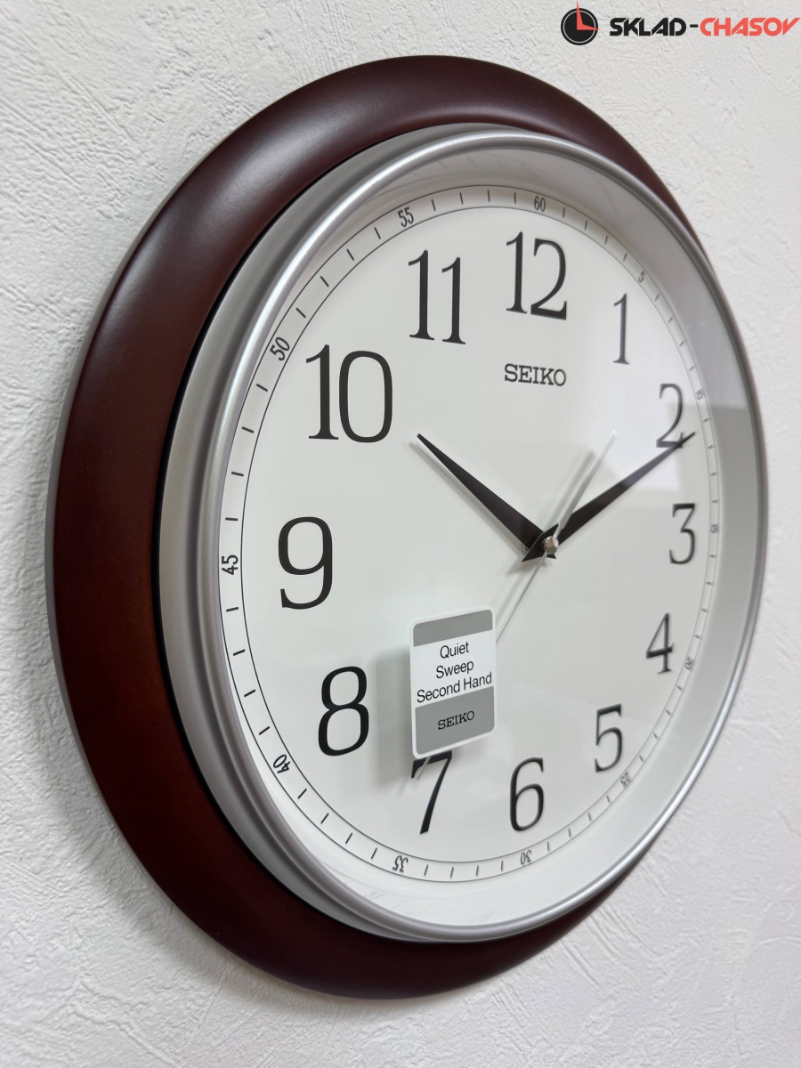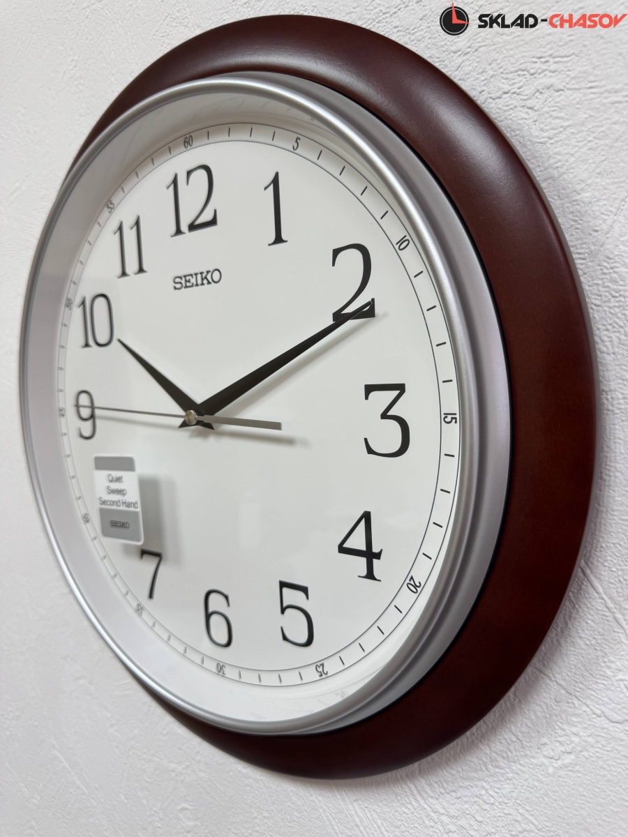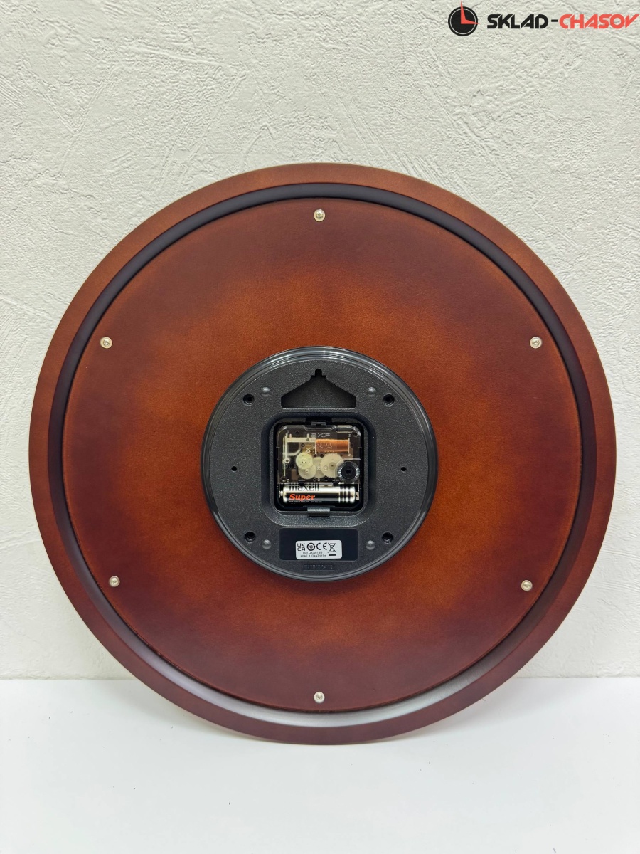 Коричневые кварцевые настенные часы с аналоговым циферблатом (стрелки). Стрелки: черная часовая, черная минутная и серебристая секундная. Циферблат белого цвета с черными арабскими цифрами. Диаметр циферблата: 31 см. Циферблат обрамлен металлическим ободком серебристого цвета. Корпус выполнен из дерева. Часы не плотно прилегают к стене, отступ 1 см. Плавный ход секундной стрелки. Бесшумный механизм.