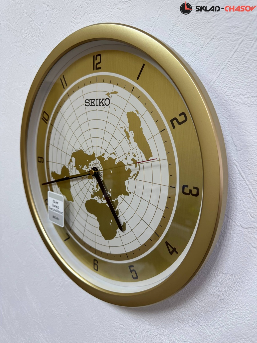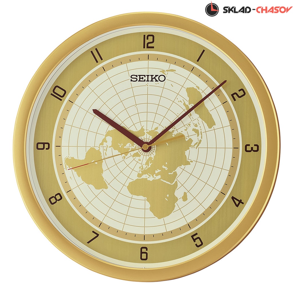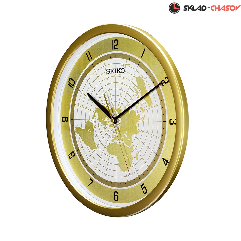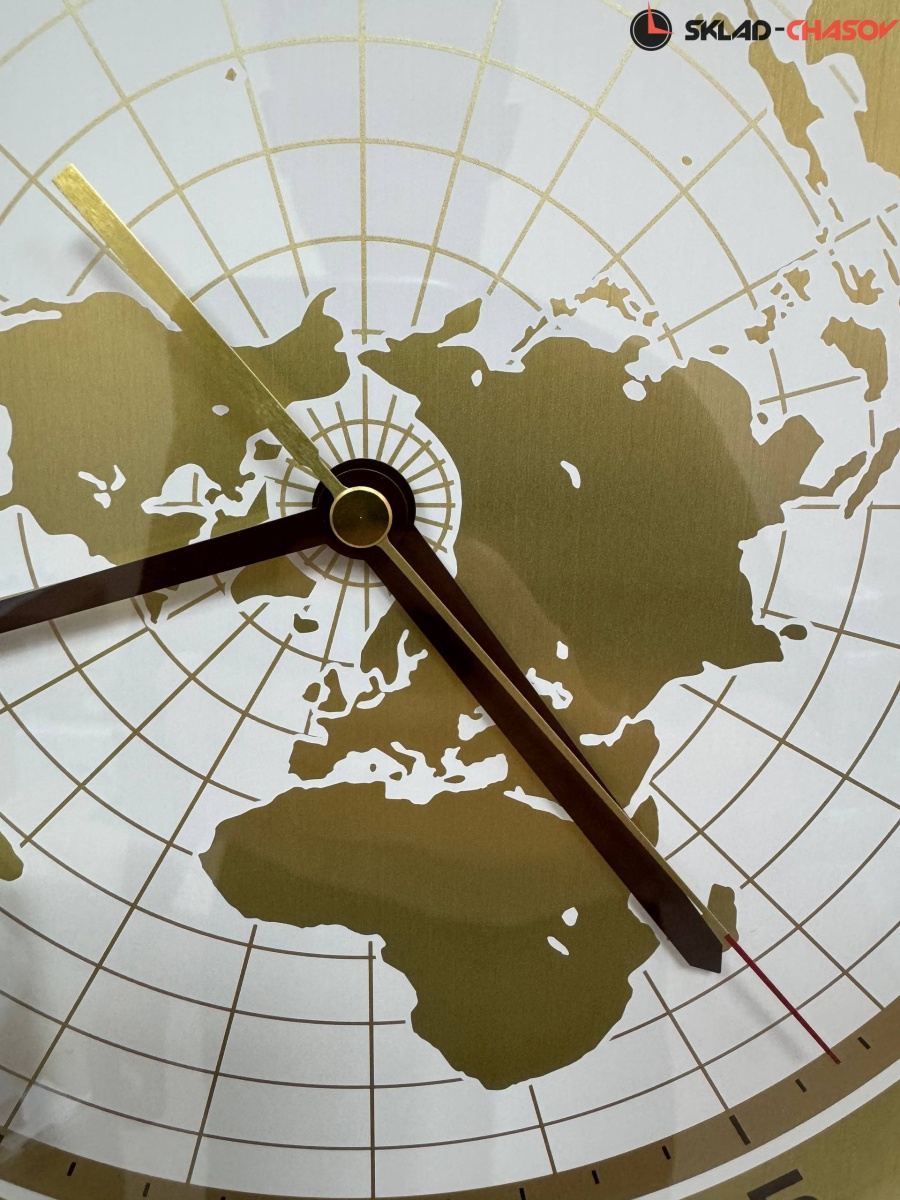 Золотистый настенные кварцевые часы с аналоговым циферблатом (стрелки). Стрелки: черная часовая, черная минутная и золотистая секундная с красным указателем на конце. На алюминиевом циферблате изображена карта мира с черными арабскими цифрами. Циферблат диаметром 32,5 см. Плавный ход секундной стрелки. Бесшумный механизм. Корпус выполнен из пластика.