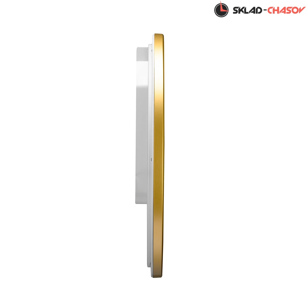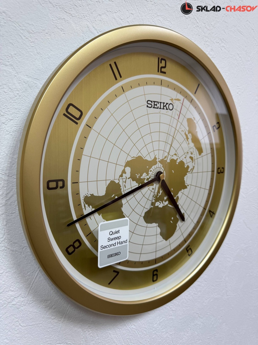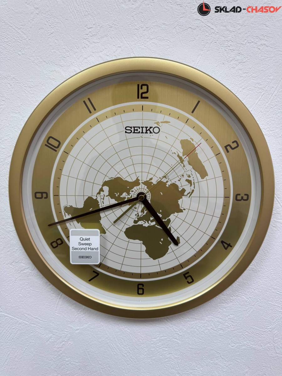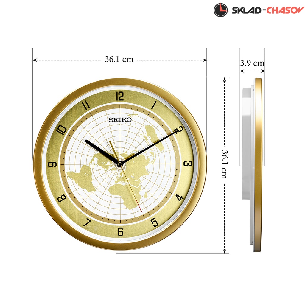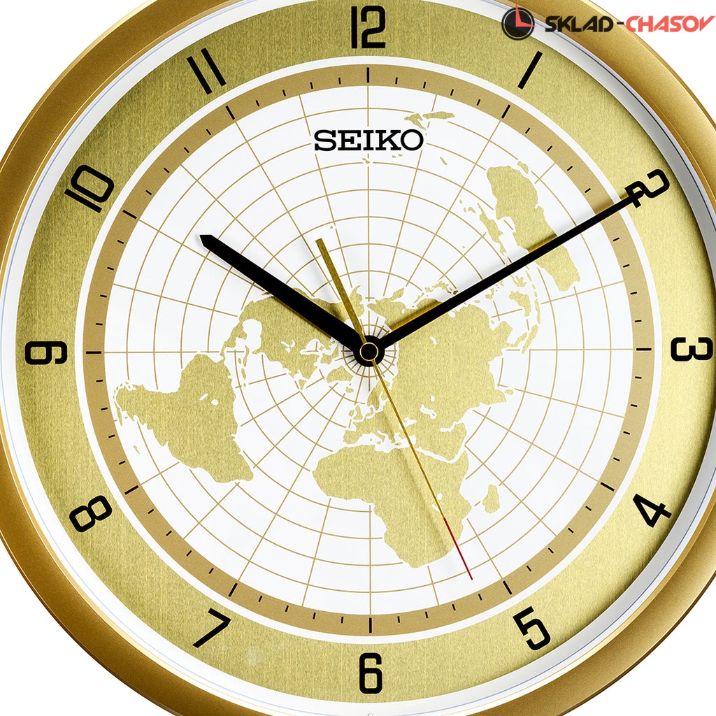 Золотистый настенные кварцевые часы с аналоговым циферблатом (стрелки). Стрелки: черная часовая, черная минутная и золотистая секундная с красным указателем на конце. На алюминиевом циферблате изображена карта мира с черными арабскими цифрами. Циферблат диаметром 32,5 см. Плавный ход секундной стрелки. Бесшумный механизм. Корпус выполнен из пластика.