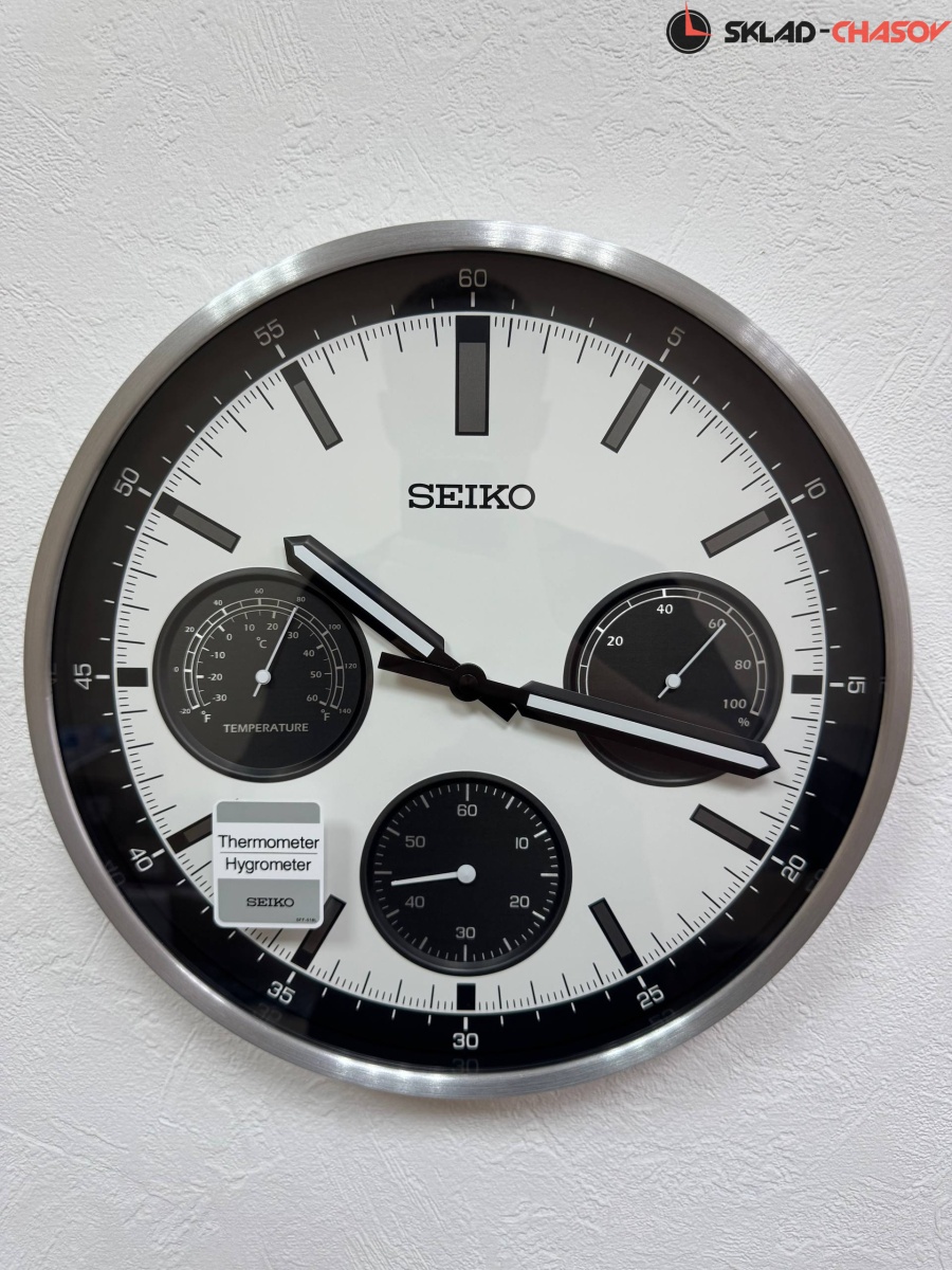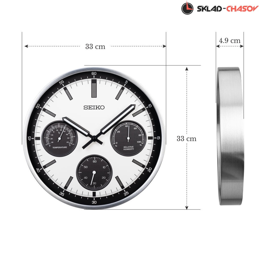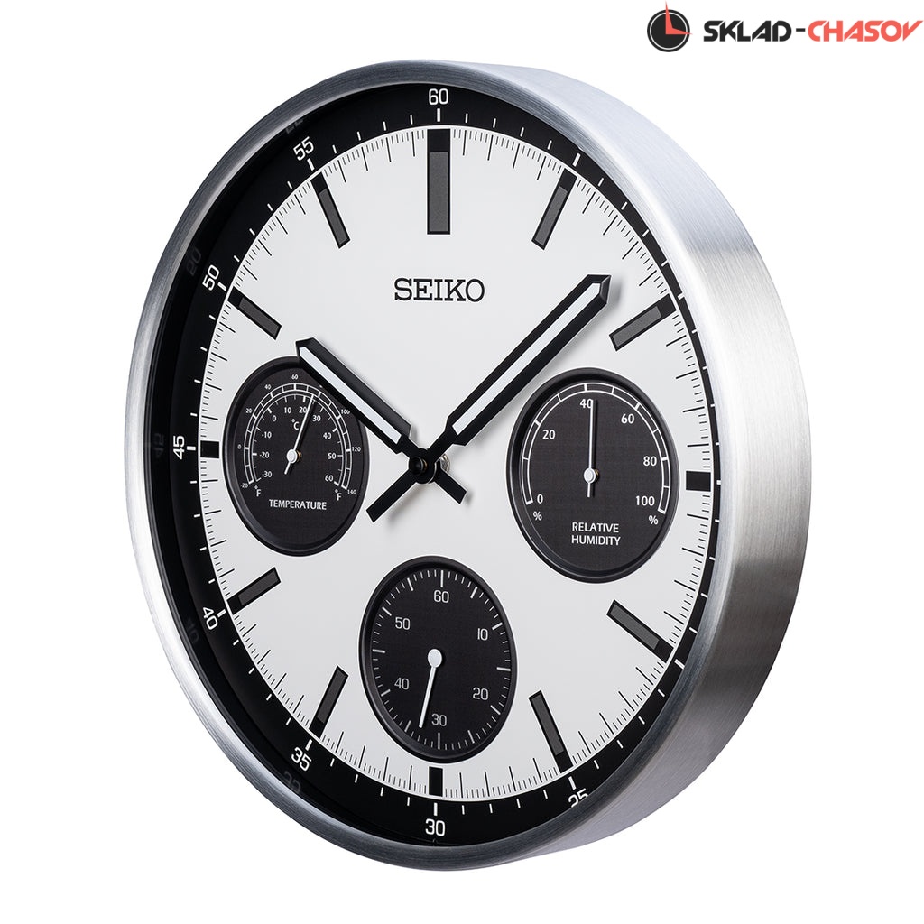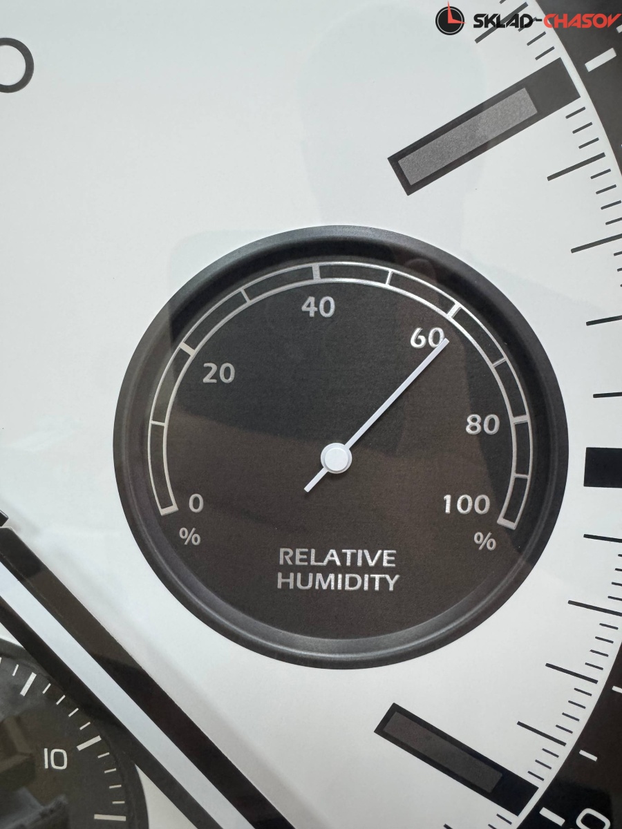 Серебристые кварцевые настенные часы с аналоговым циферблатом (стрелки). Стрелки: черная часовая, черная минутная и белая секундная. Белый циферблат с черными рисками. Часы вынесены на отдельный циферблат в районе 6 часов. Часы определяют температуру и влажность воздуха в помещении, показания выносятся на циферблат. Металлический корпус.