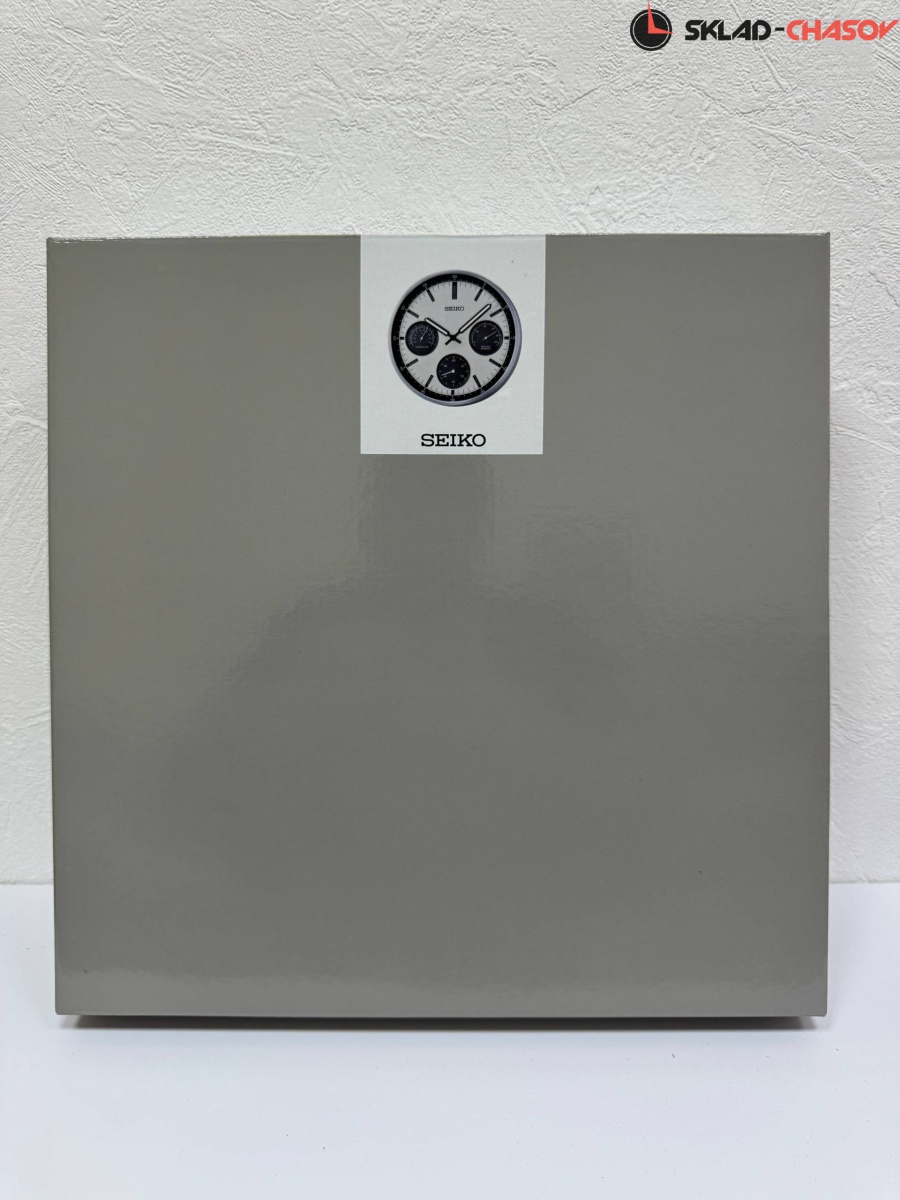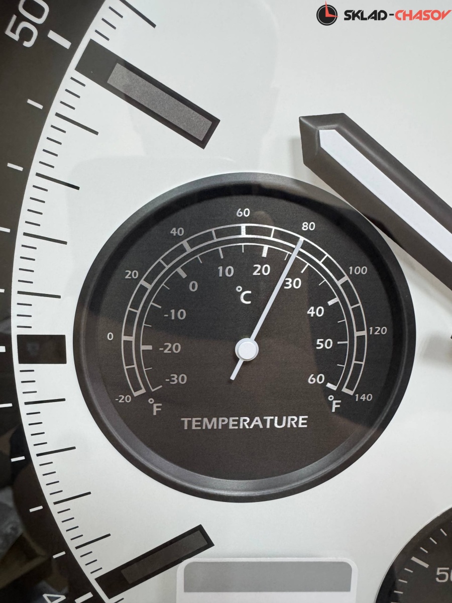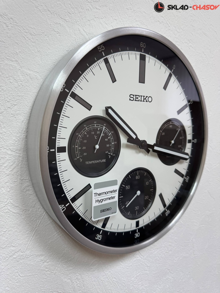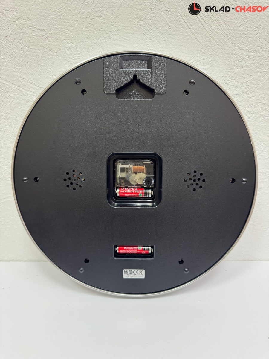 Серебристые кварцевые настенные часы с аналоговым циферблатом (стрелки). Стрелки: черная часовая, черная минутная и белая секундная. Белый циферблат с черными рисками. Часы вынесены на отдельный циферблат в районе 6 часов. Часы определяют температуру и влажность воздуха в помещении, показания выносятся на циферблат. Металлический корпус.