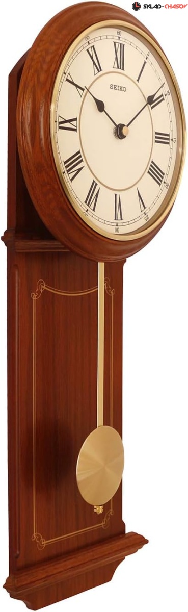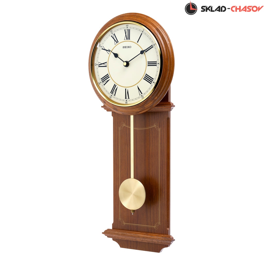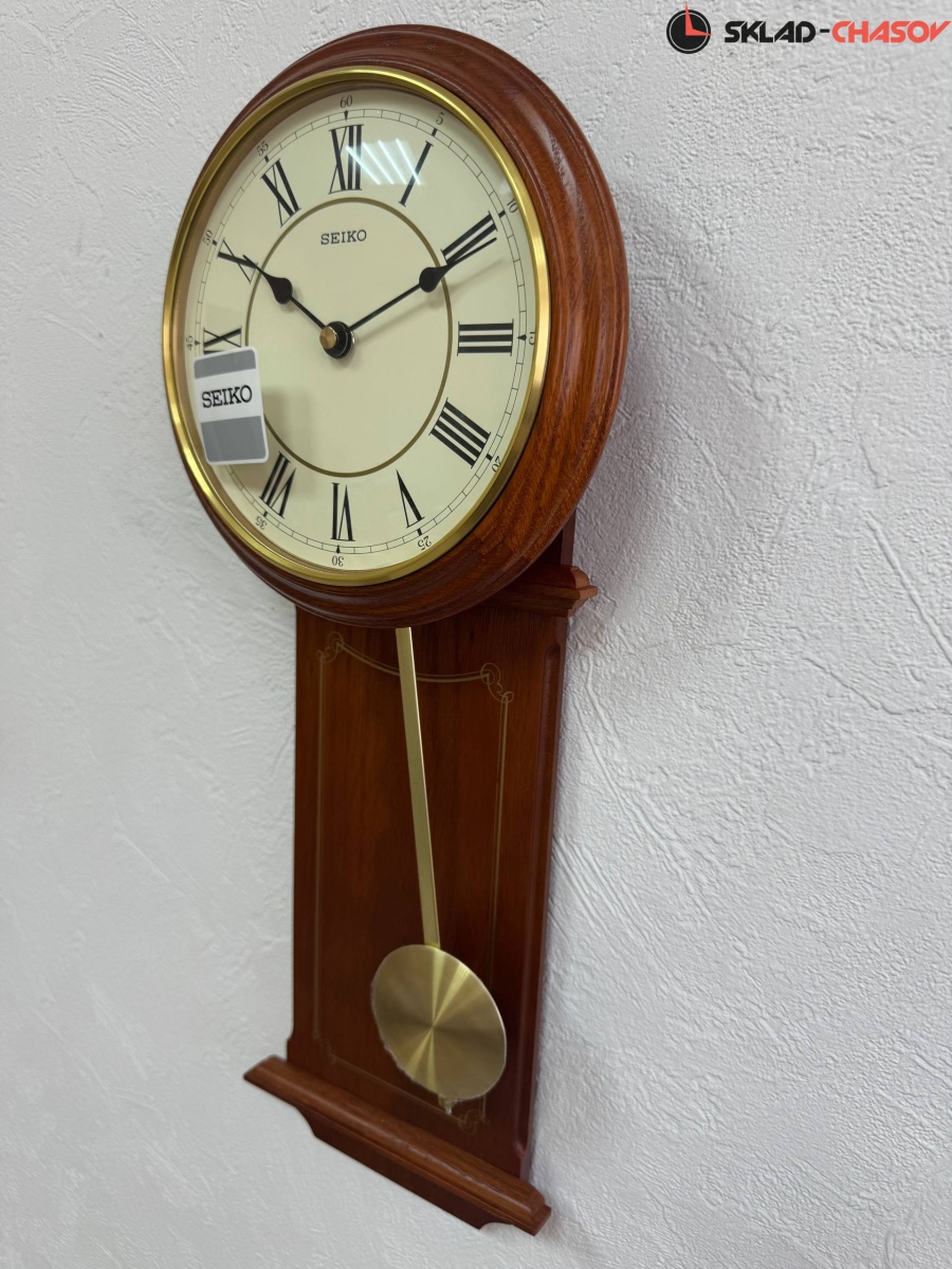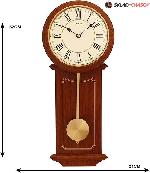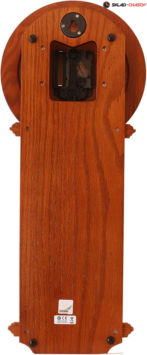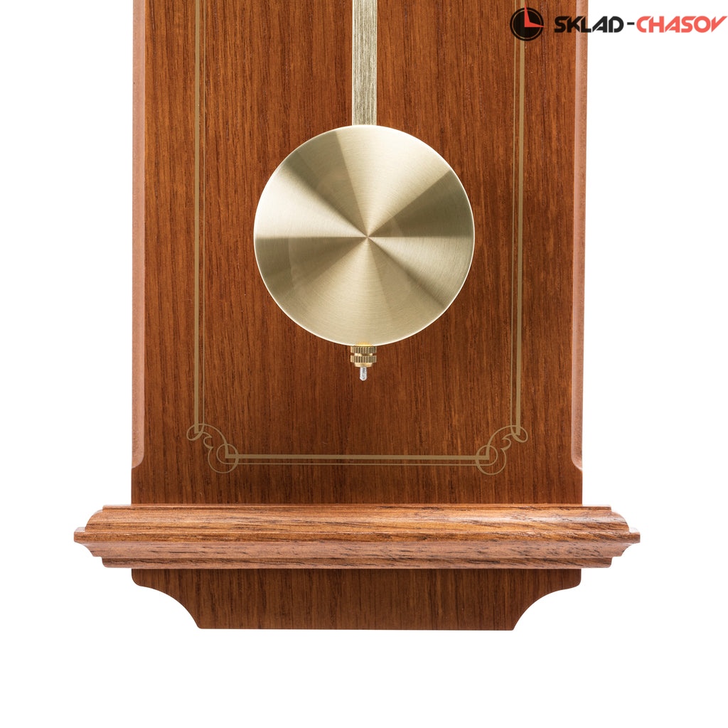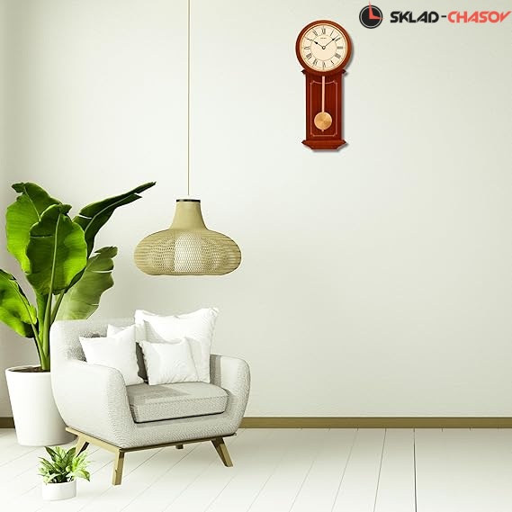 Кварцевые деревянные настенные часы с маятником. Циферблат бежевого цвета с римскими цифрами. Стрелки: черная часовая и черная минутная. Корпус выполнен из Дуб/МДФ.
