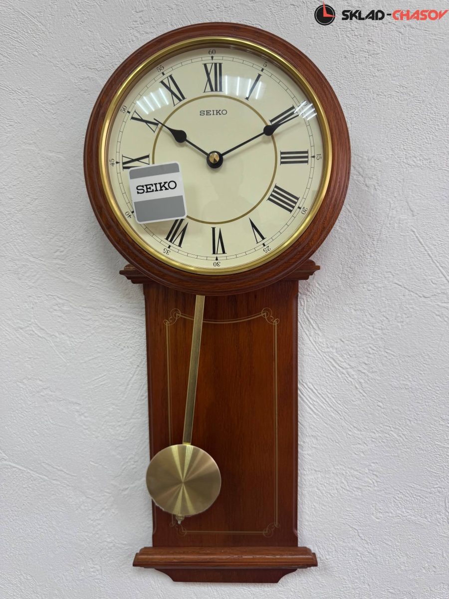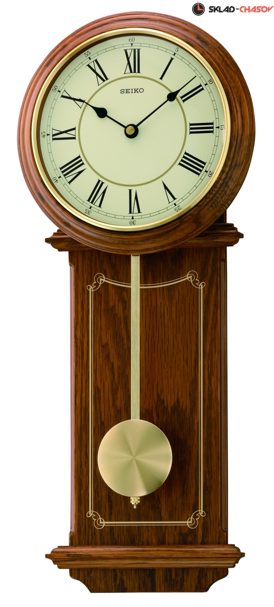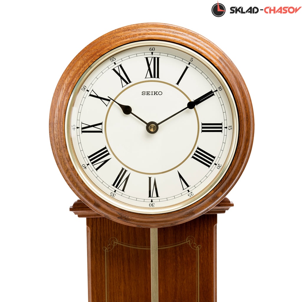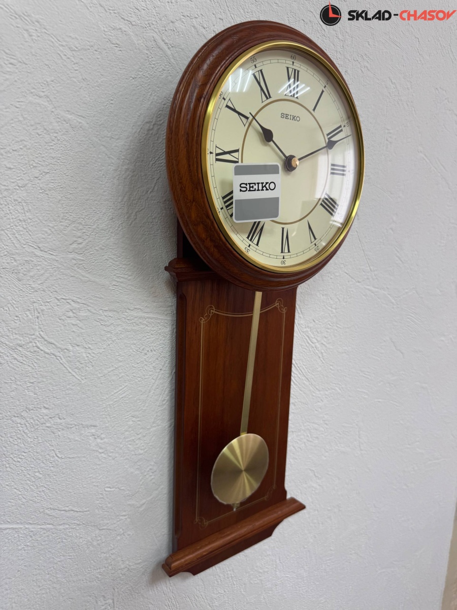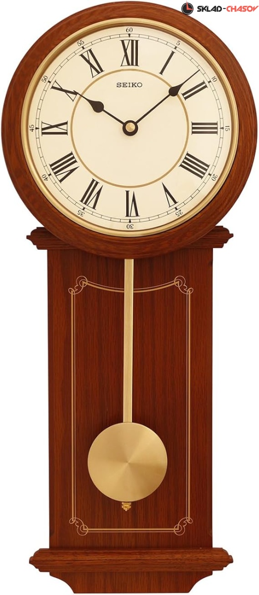 Кварцевые деревянные настенные часы с маятником. Циферблат бежевого цвета с римскими цифрами. Стрелки: черная часовая и черная минутная. Корпус выполнен из Дуб/МДФ.