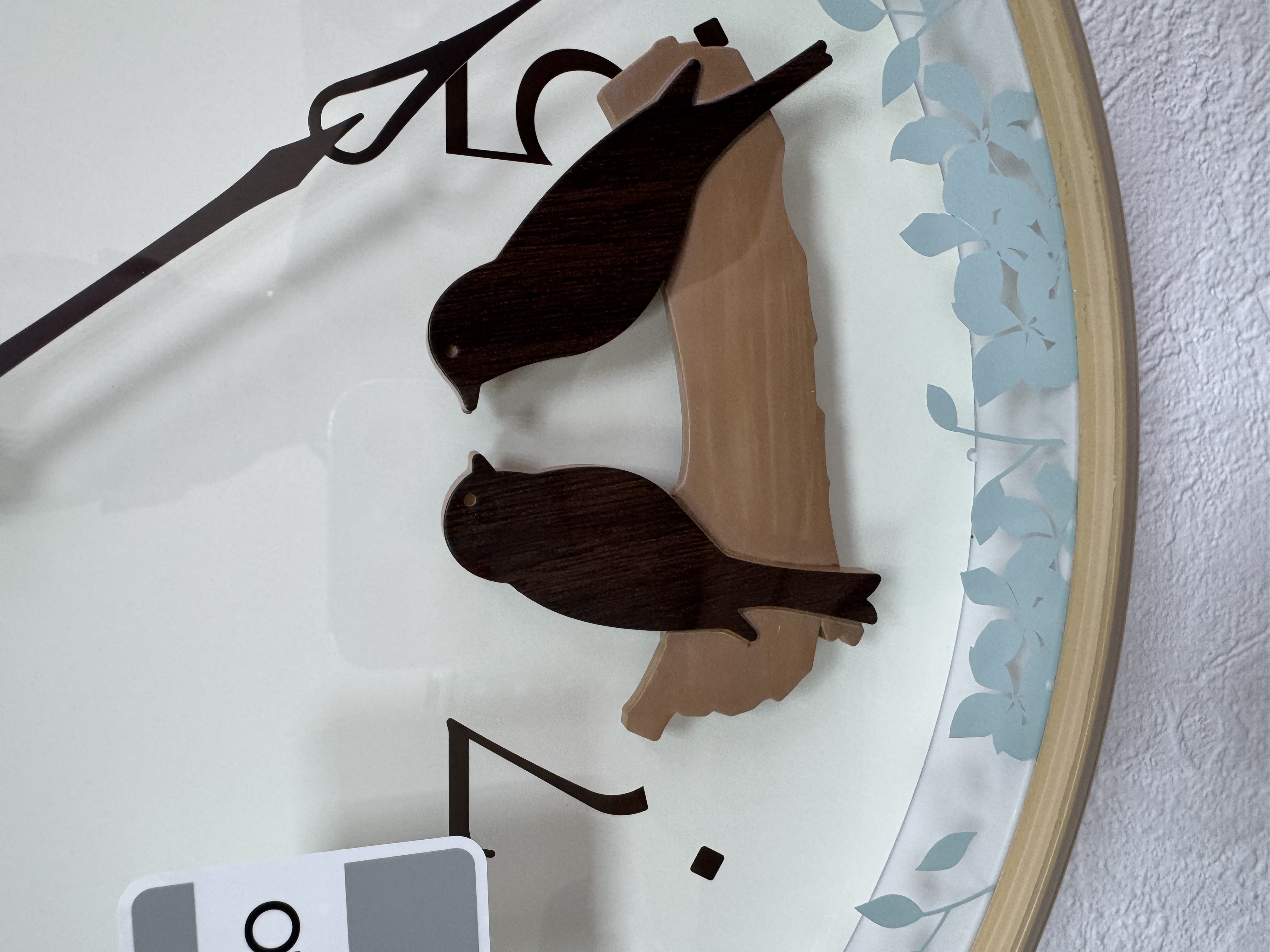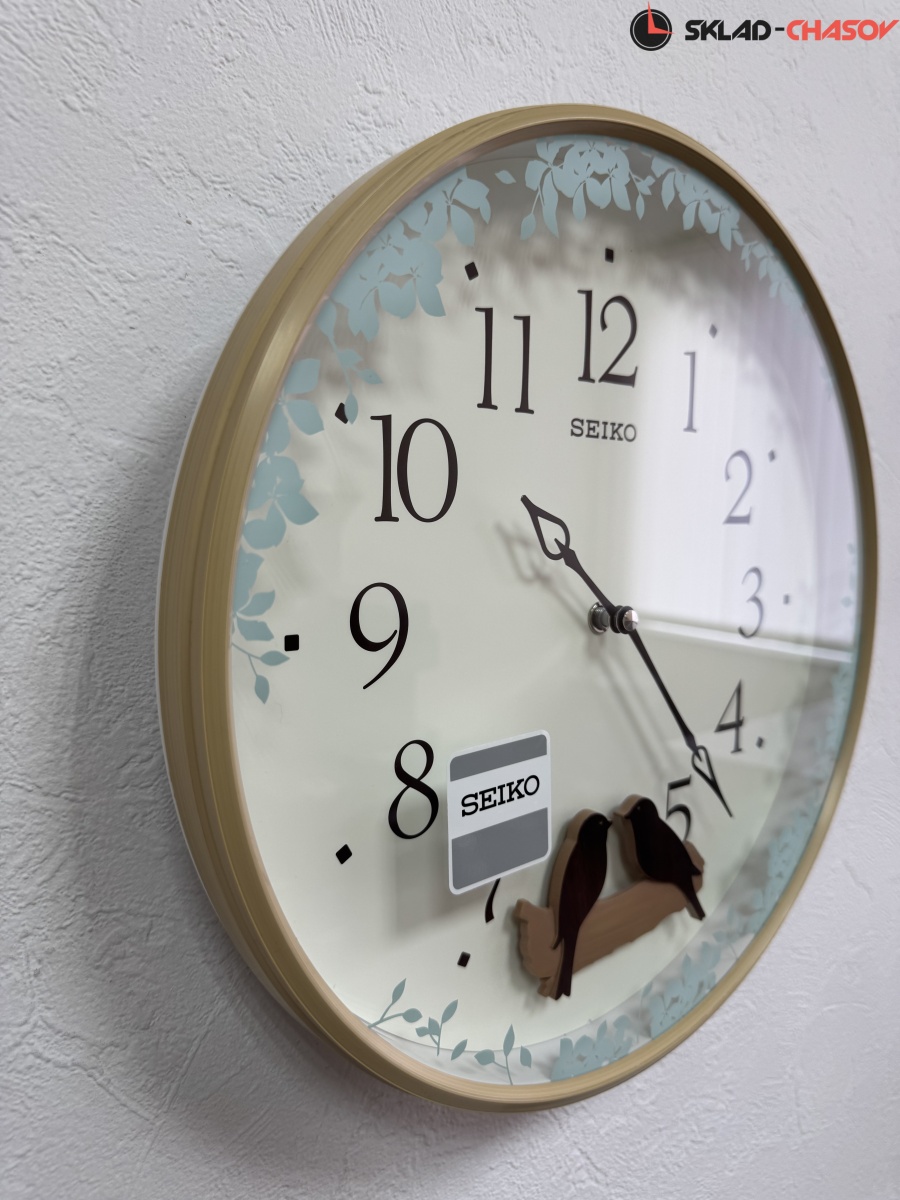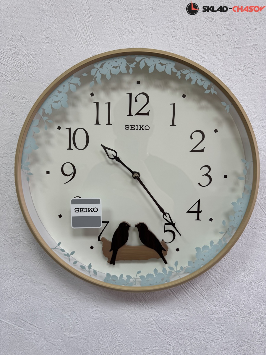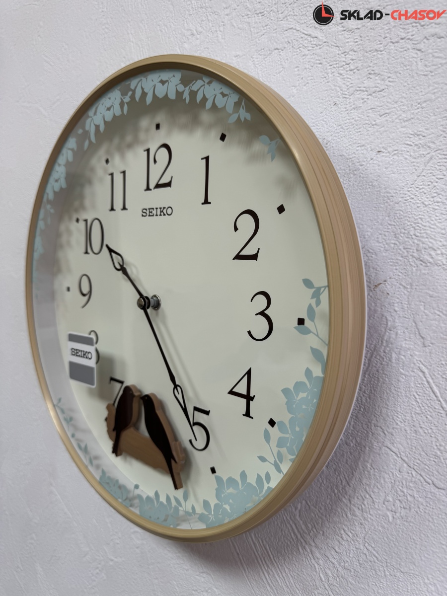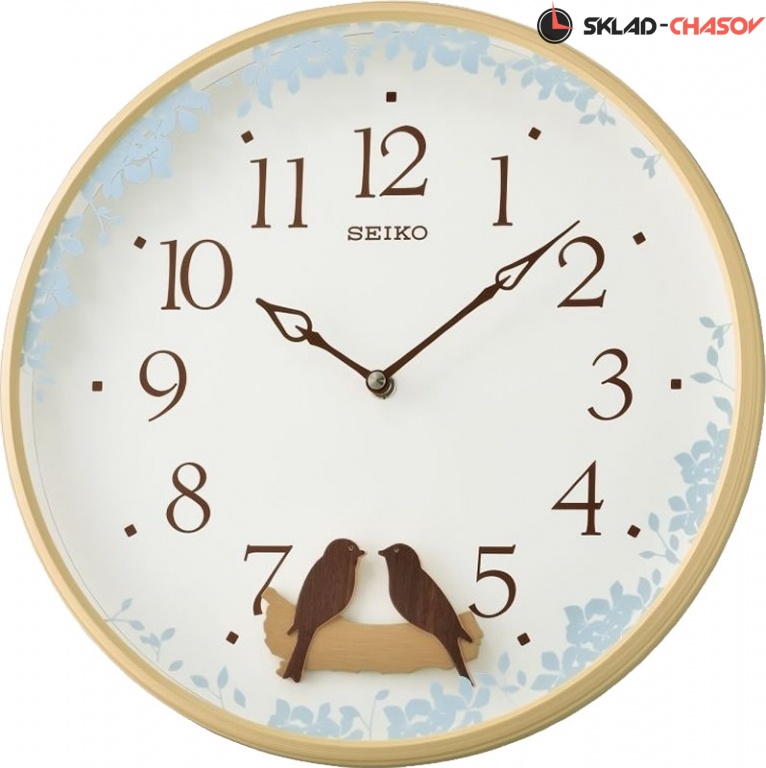 Коричневые настенные кварцевые часы с аналоговым циферблатом (стрелки). Стрелки: черная часовая, черная минутная. Бежевый циферблат с арабскими цифрами, закрыт стеклом. Корпус выполнен из пластика. В районе 6 часов расположен маятник в виде качающихся птичек.