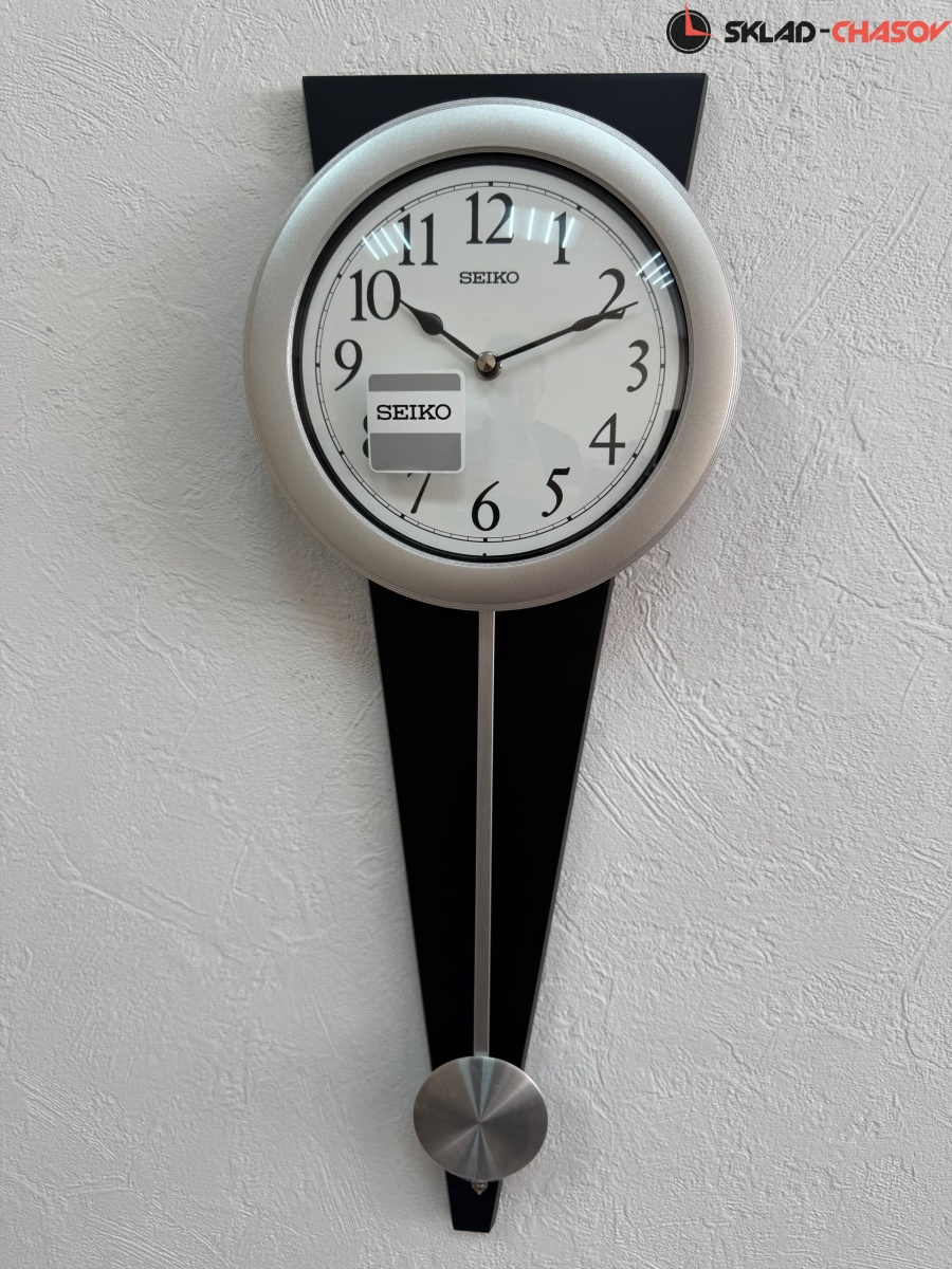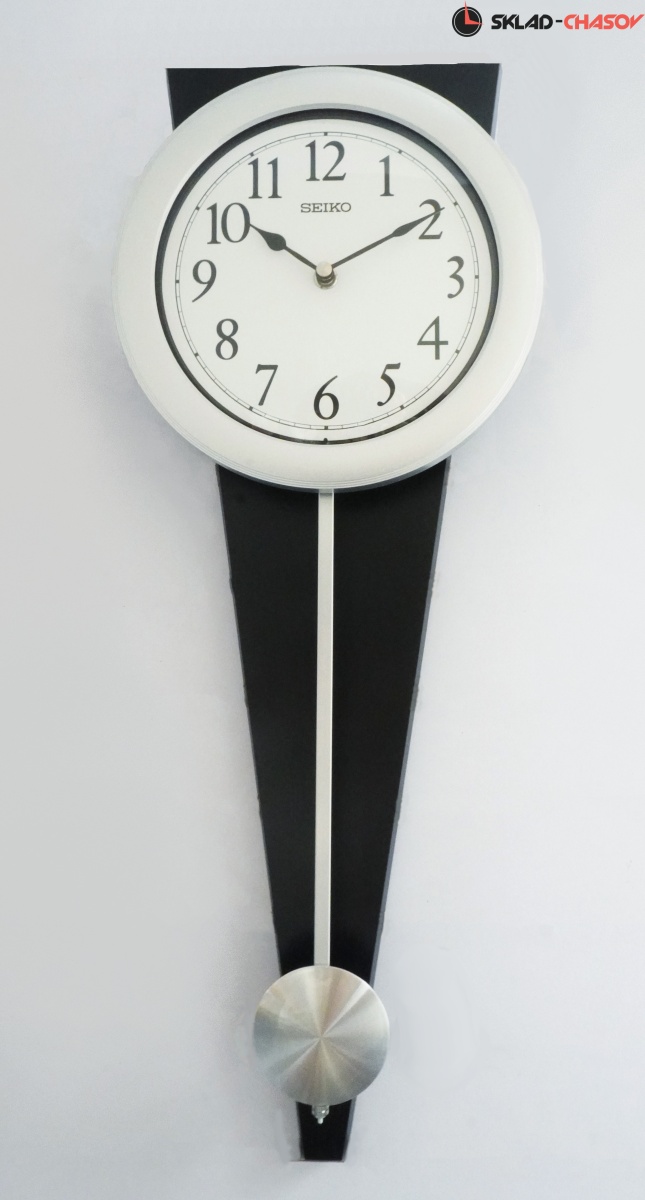 Черные настенные кварцевые часы с аналоговым циферблатом (стрелки). Стрелки: черная часовая, черная минутная. Белый арабский циферблат закрыт стеклом. Бесшумный механизм. Корпус выполнен из дерева. Под циферблатом расположен маятник серебристого цвета.