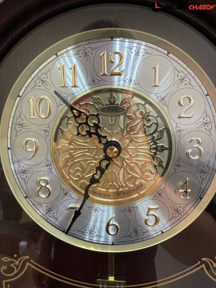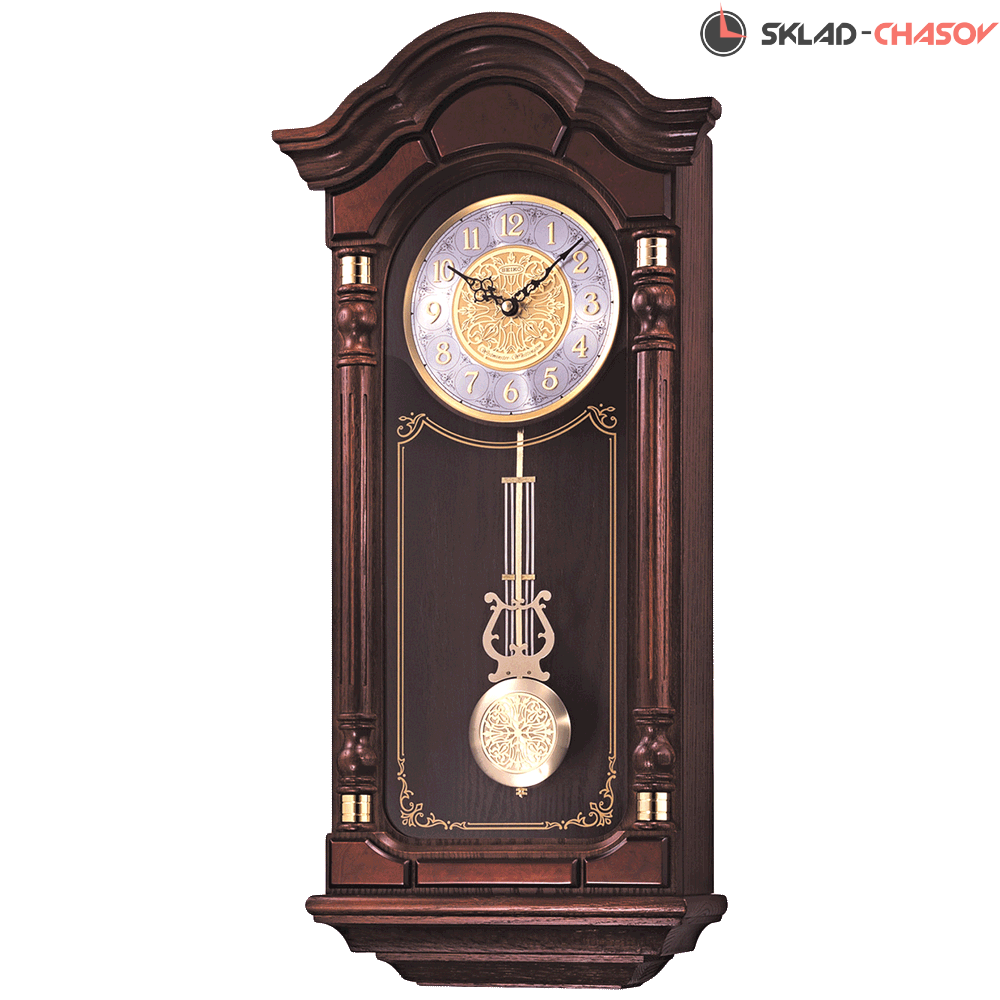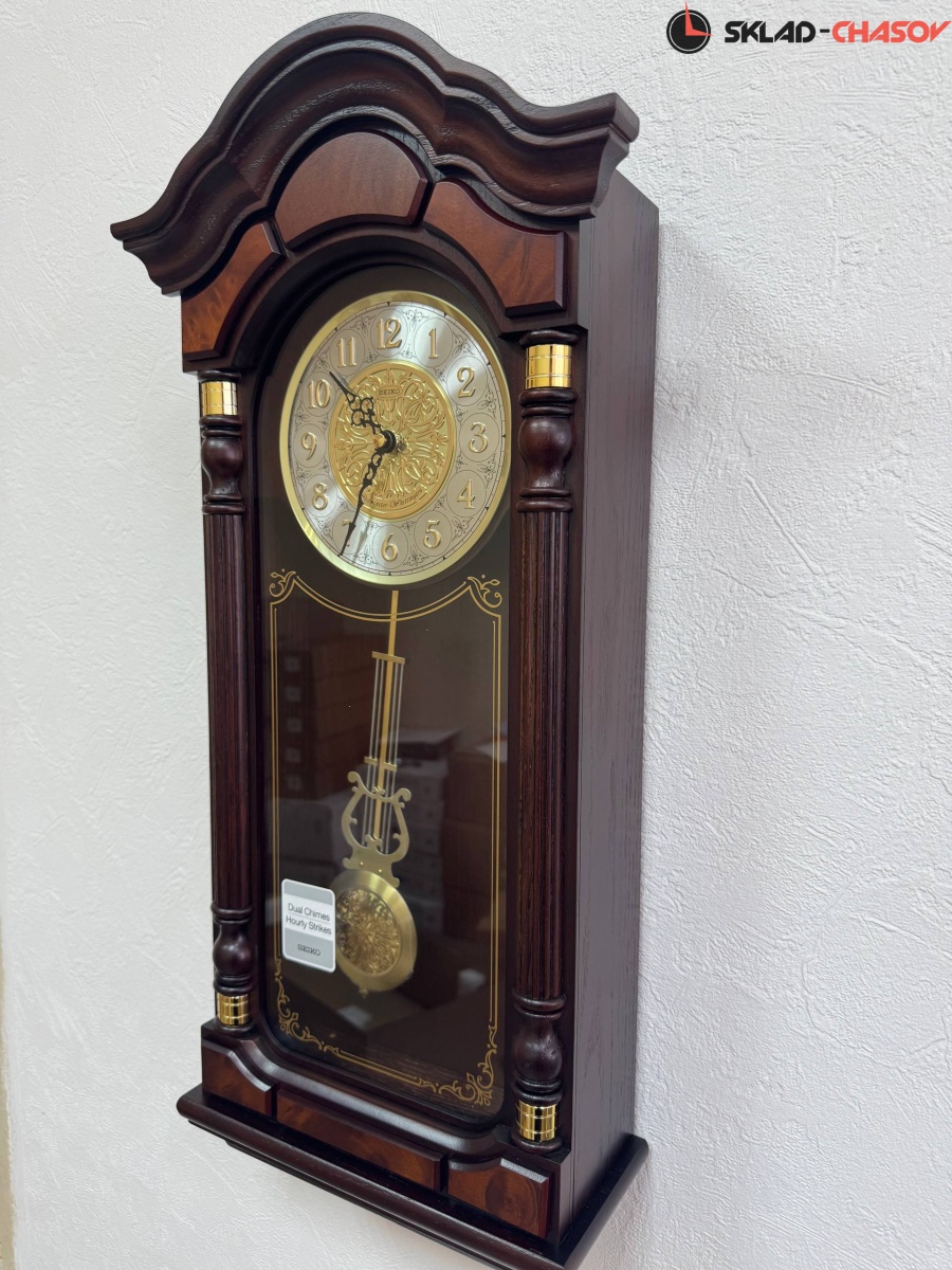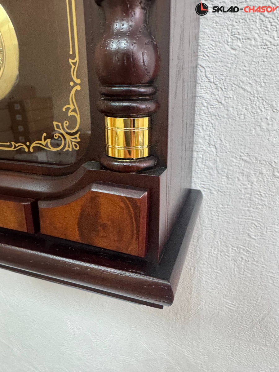 Коричневые кварцевые настенные часы с аналоговым циферблатом (стрелки). Стрелки: черная часовая, черная минутная. Серебристый циферблат с объёмными золотистыми арабскими цифрами. Циферблат закрыт стеклом. Ниже циферблата расположился маятник золотистого цвета. Две мелодии на выбор Westminster/Whittington. Бой каждые 15 минут по четвертям. Ровно в час полная мелодия и бой по количеству часов. Регулятор громкости. Автоматическое отключение звука на ночь с 23.00 до 5.45. Корпус выполнен из дерева (дуб). Бесшумный механизм.