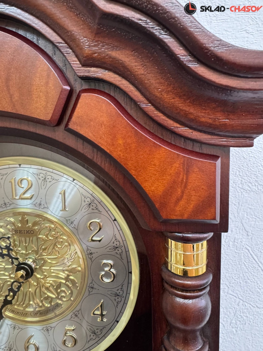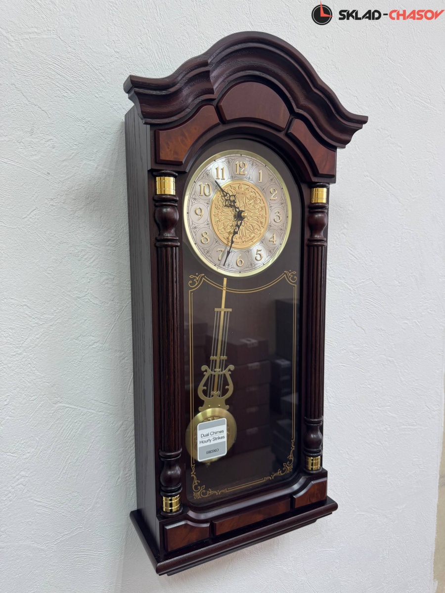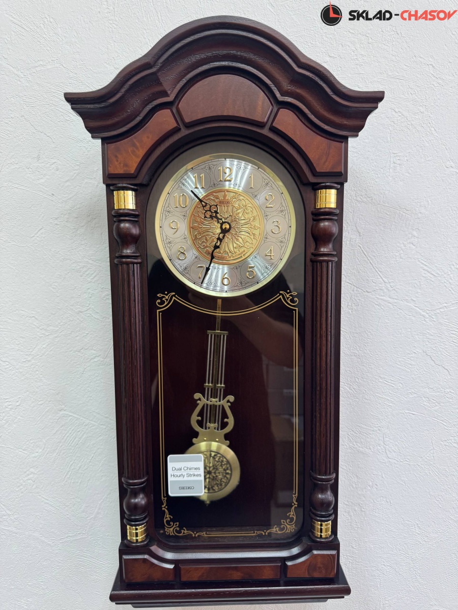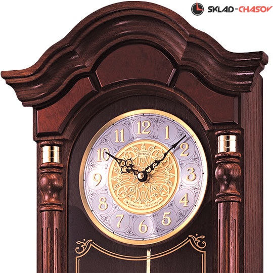 Коричневые кварцевые настенные часы с аналоговым циферблатом (стрелки). Стрелки: черная часовая, черная минутная. Серебристый циферблат с объёмными золотистыми арабскими цифрами. Циферблат закрыт стеклом. Ниже циферблата расположился маятник золотистого цвета. Две мелодии на выбор Westminster/Whittington. Бой каждые 15 минут по четвертям. Ровно в час полная мелодия и бой по количеству часов. Регулятор громкости. Автоматическое отключение звука на ночь с 23.00 до 5.45. Корпус выполнен из дерева (дуб). Бесшумный механизм.