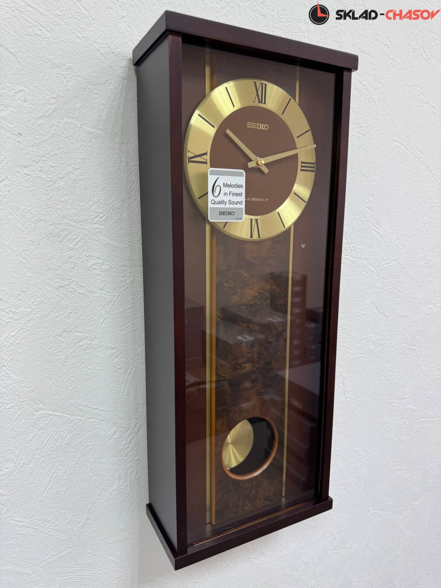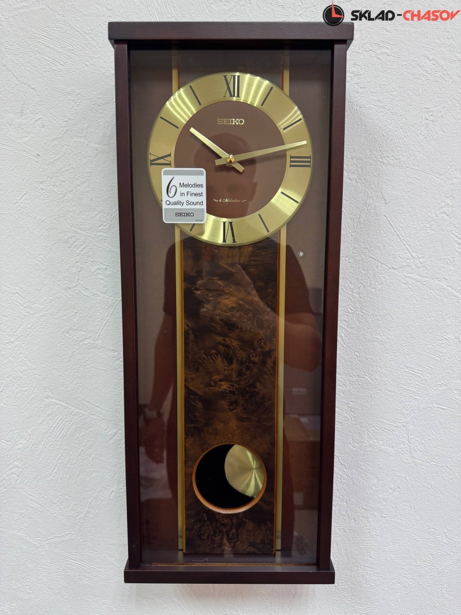 Коричневые настенные кварцевые часы с аналоговым циферблатом (стрелки). Стрелки: золотистая часовая, золотистая минутная. Золотистый алюминиевый циферблат. Временные рамки обозначены римскими цифрами и визирами (черточками). Бесшумный механизм. 6 мелодий на выбор. Регулировка громкости. Датчик освещенности (отключает воспроизведение мелодий в темноте). Корпус коричневого цвета выполнен из дерева. Под циферблатом в окне расположен маятник золотистого цвета.