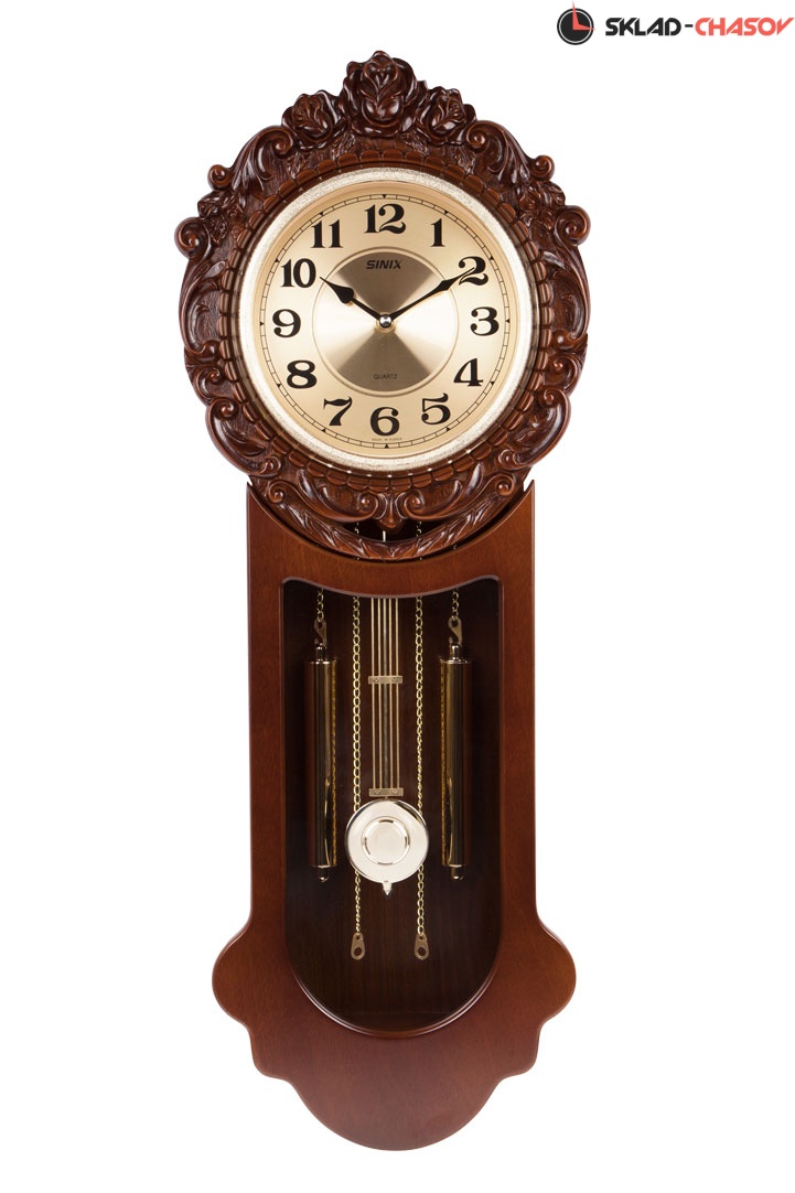 Корейские Настенные часы Sinix 07 высокого качества, имеют надежный кварцевый механизм. Характерной особенностью этой модели является раскачивающийся маятник; не влияет на ход часов;. Бой и мелодия отсутствуют. Гири выполняют эстетическую функцию. Классический круглый циферблат, временные рамки обозначены большими арабскими цифрами