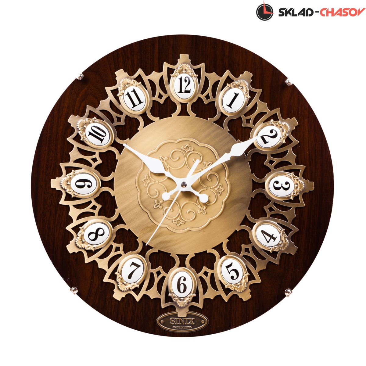 Часы полностью на деревянной основе (МДФ) закрытые сверху стеклом. Сам циферблат выполнен из ажурной металической накладки.