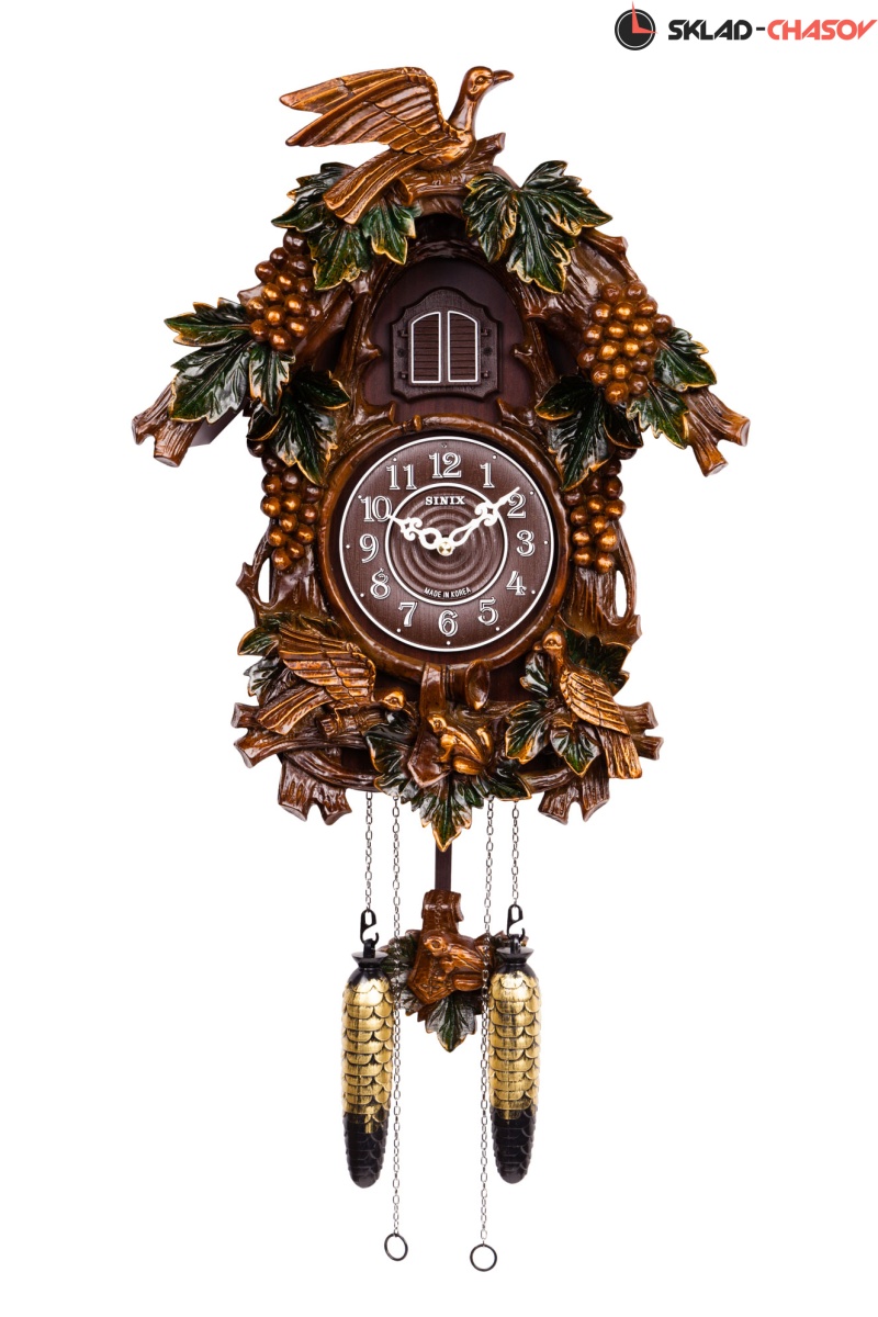 Кварцевый механизм. Светочувствительный элемент, который автоматически переводит часы в ночной режим работы (в темноте кукушка не срабатывает). Регулятор громкости.