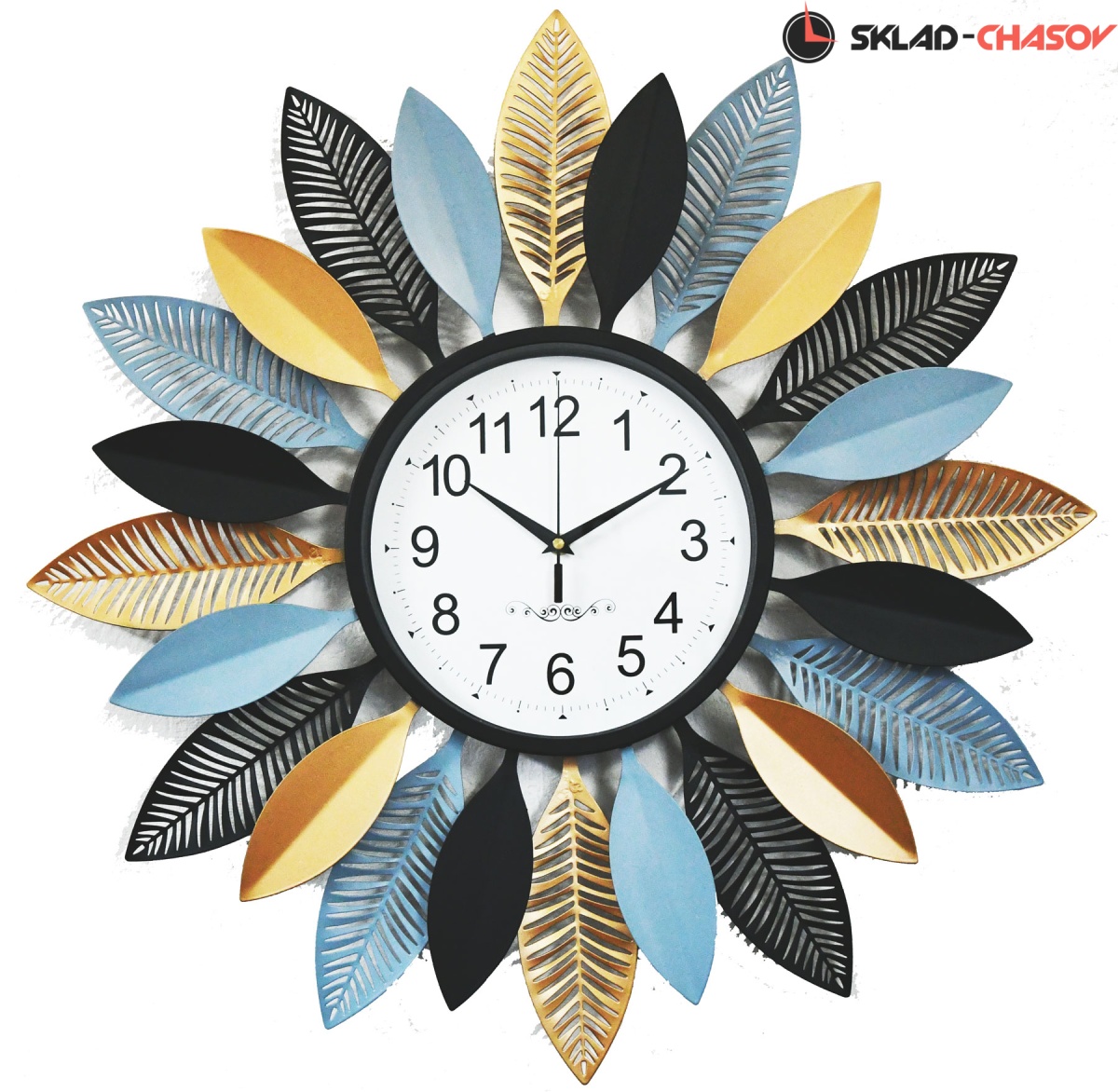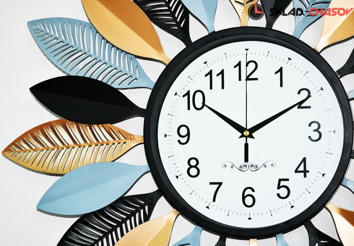 Кварцевый механизм. Бесшумный ход. Циферблат под стеклом, в обрамлении элементов в виде лепестков черного, голубого и золотистого цветов. Корпус из металла.