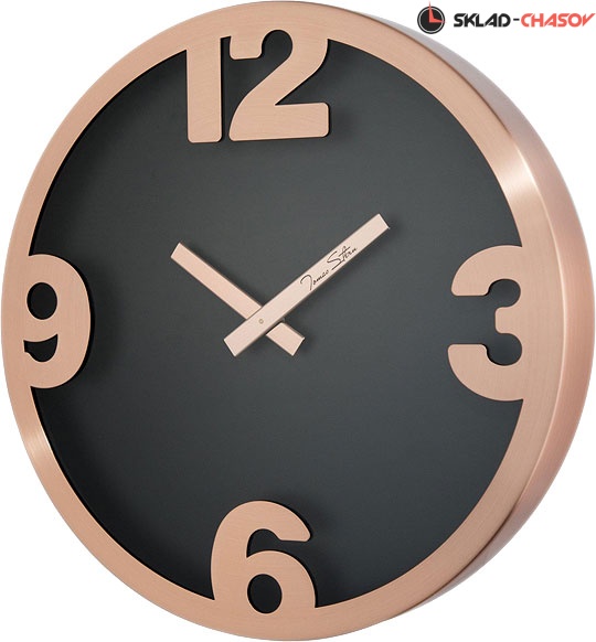 Настенные часы в шлифованном металлическом корпусе медного цвета. Арабские цифры 3, 6, 9 и 12 представляют собой единое целое с ободком. Глянцевые стрелки медного цвета. Матовый черный циферблат выполнен из пластика и закрыт стеклом. Кварцевый механизм Young Town (Гонконг). Требуется 1 батарейка типа АА (не включена в поставку).