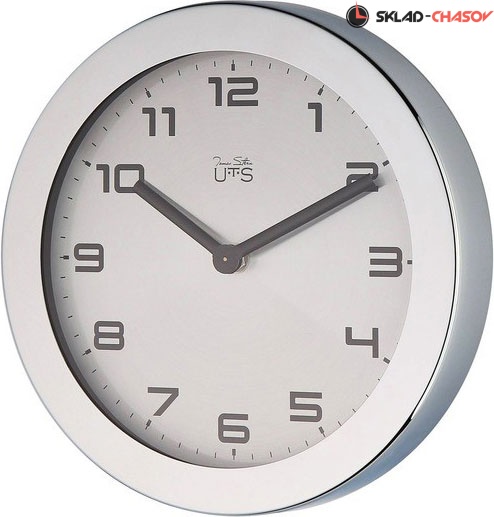 Настенные часы в полированном металлическом корпусе серебряного цвета. Шлифованный металлический циферблат с черными арабскими цифрами и стрелками.