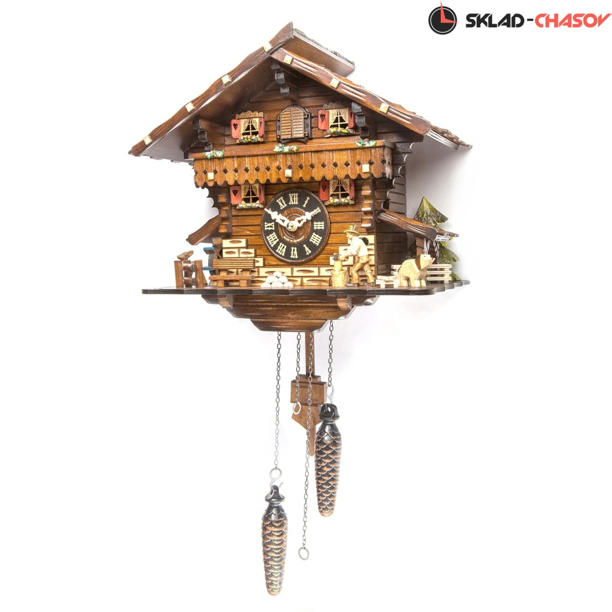 Кварцевый механизм не требующий подзавода .12 мелодий Автоматическое отключение мелодии на ночь .Водяное колесо и лесоруб двигаются .Корпус выполнен в форме домика из дерева .Временные рамки обозначены римскими цифрами.