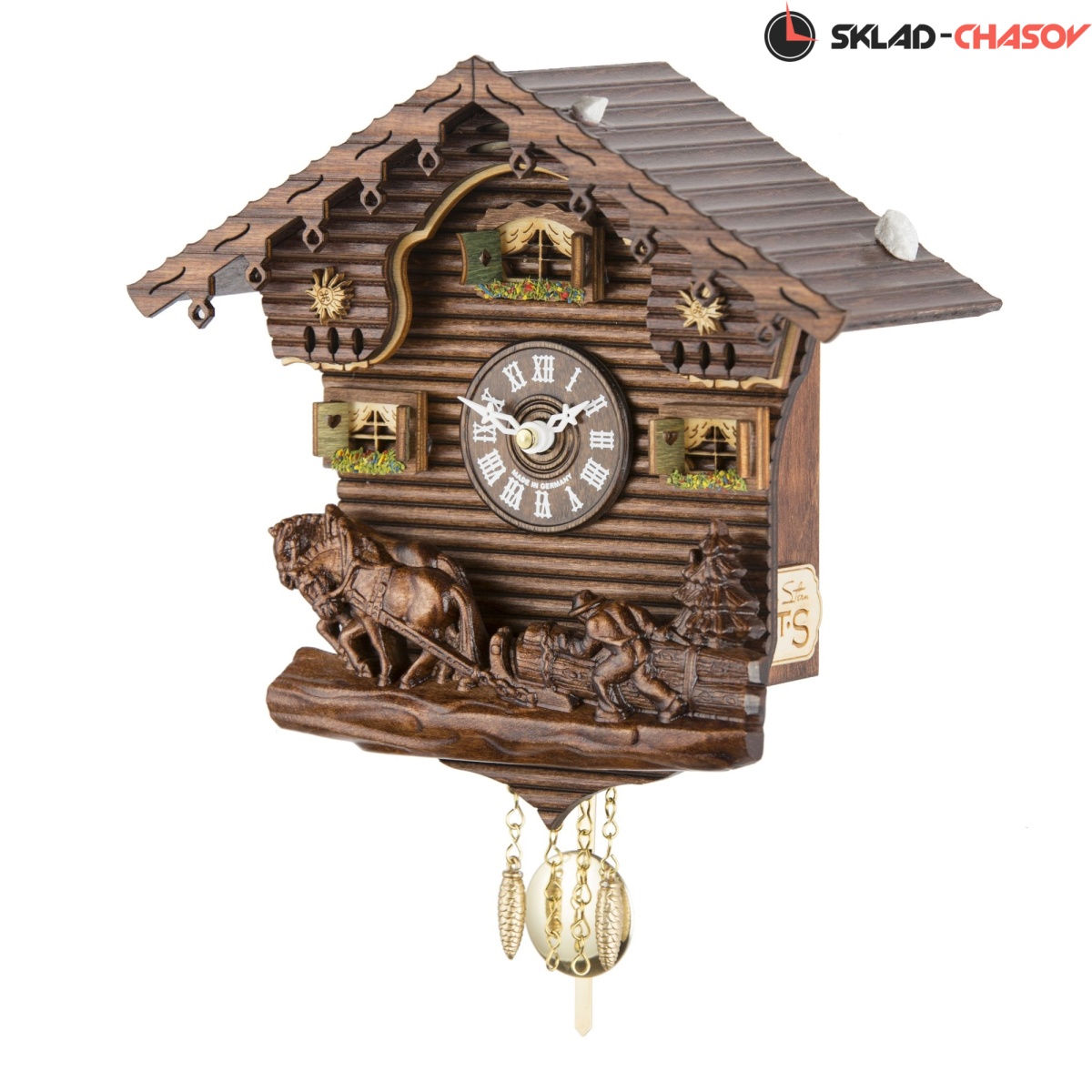 Кварцевые настенные часы с кукушкой Tomas Stern 5031 , не требуют подзавода.Корпус выполнен из натурального дерева с резными элементами, в форме домика. На корпусе вырезаны два окошка и лошади и рабочий. Еще одна история от Tomas Stern. Часы оснащены 2-мя мелодиями на выбор: Кукушка или Вестминстер. Циферблат круглой формы не большого размера в коричневом цвете. Временные рамки обозначены римскими цифрами белого цвета.