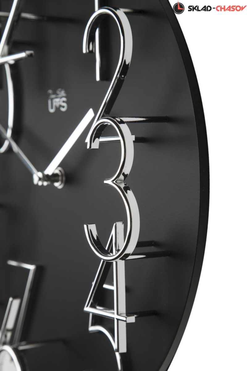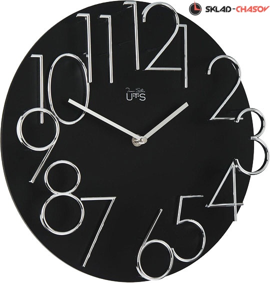 Кварцевые настенные часы в современном стиле. Эффектное сочетание черного основания и хромированых цифр отлично подойдет для хай-тек интерьера. Цифры расположены на разном уровне, что создает дополнительный объем. Корпус выполнен из МДФ и пластика. Механизм Young Town.