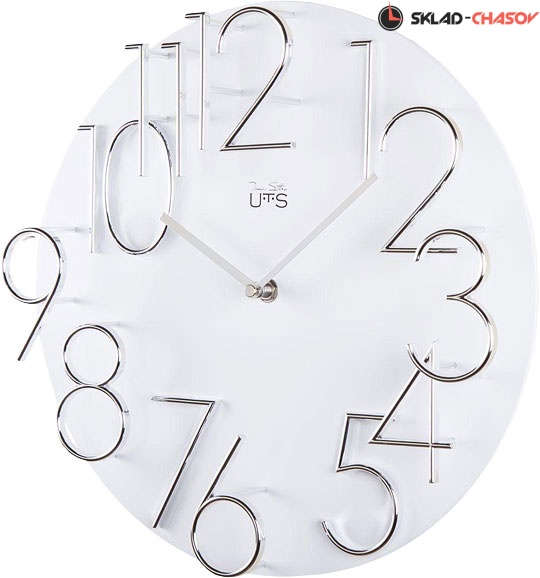 Кварцевые настенные часы в современном стиле. Эффектное сочетание белого основания и хромированых цифр отлично подойдет для хай-тек интерьера. Цифры расположены на разном уровне, что создает дополнительный объем. Корпус выполнен из МДФ, цифры из пластика. Механизм Young Town с плавным ходом.
