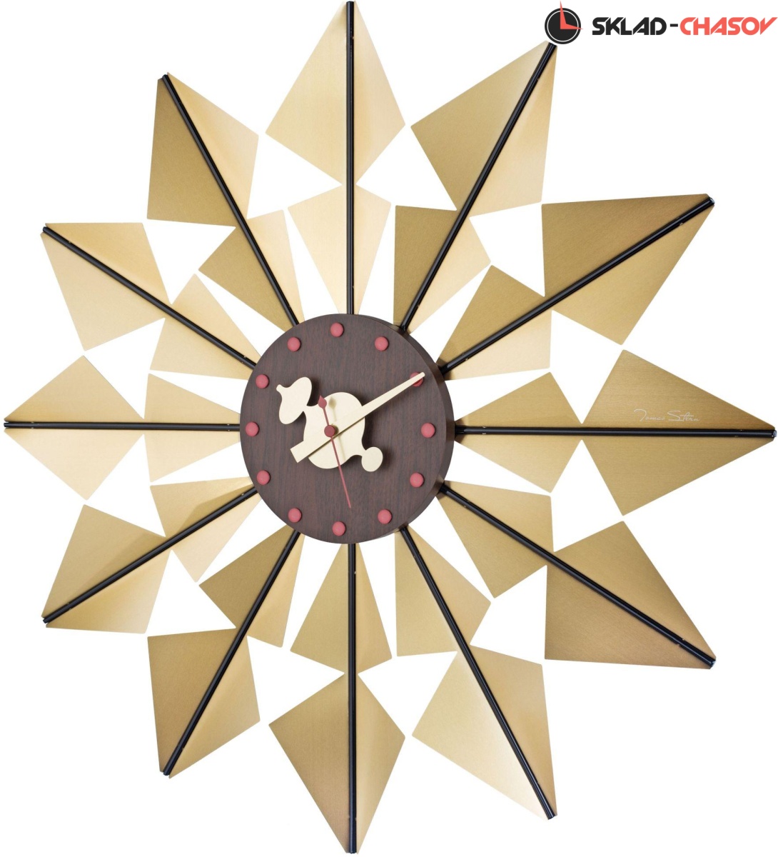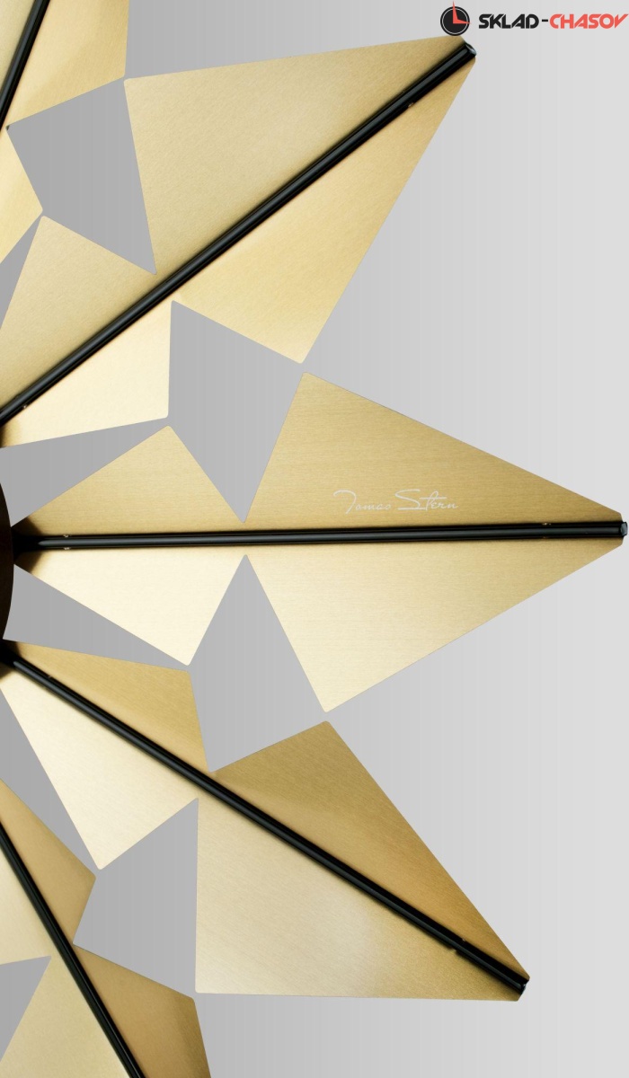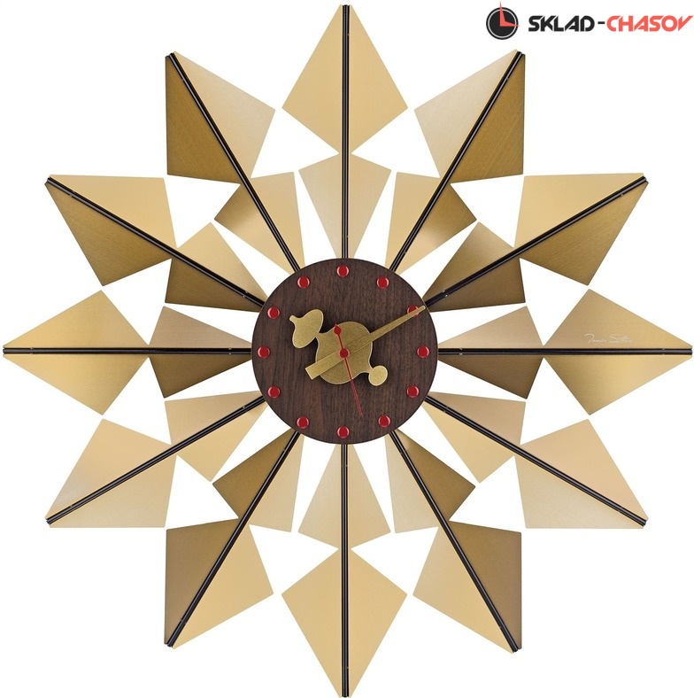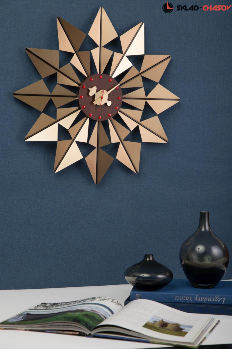Эти оригинальные настенные часы в стиле модерн выполнены по мотивам известной модели часов "The Flock of Butterflies Clock" легендарного дизайнера - Джорджа Нельсона. Название происходит от многомерной, напоминающей крыло бабочки формы часов. Вокруг теплого, деревянного циферблата многочисленные металлические треугольники. Их отражающие поверхности вспыхивают светом, придавая часам общий калейдоскопический эффект.