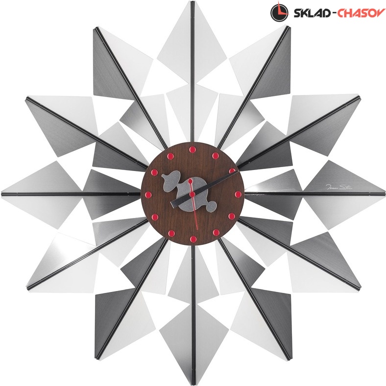 Эти оригинальные настенные часы в стиле модерн выполнены по мотивам известной модели часов "The Flock of Butterflies Clock" легендарного дизайнера - Джорджа Нельсона. Названиепроисходит от многомерной, напоминающей крыло бабочки формы часов. Вокруг теплого, деревянного циферблата многочисленные металлические треугольники. Ихотражающие поверхности вспыхивают светом, придавая часам общий калейдоскопический эффект. Корпус изготовлен из металла и дерева. Механизм Young Town с плавным ходом секундной стрелки.