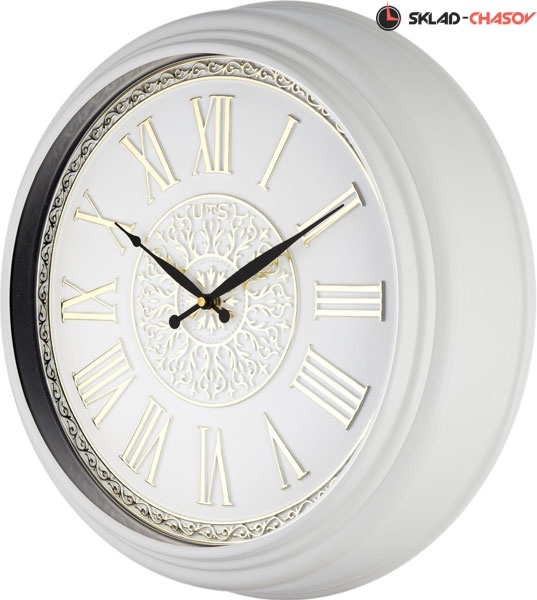 Кварцевые настенные часы. Изготовлены из пластика белого цвета. Объемные римские цифры и узор в центре циферблата - золотого цвета. Механизм Young Town (Гонконг).