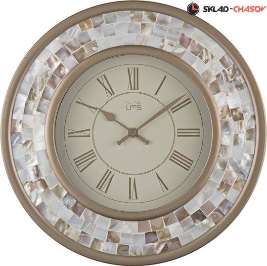 Настенные часы в пластиковом корпусе, ободок отделан перламутровыми вставками. Циферблат закрыт стеклом. Кварцевый механизм Young Town (Гонконг). Требуется 1 батарейка типа АА (не включена в поставку).