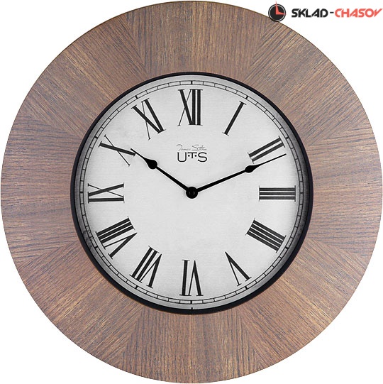 Кварцевые настенные часы в пластиковом корпусе. Широкий ободок отделан под дерево, состаренный циферблат с римскими цифрами закрыт стеклом. Механизм Young Town