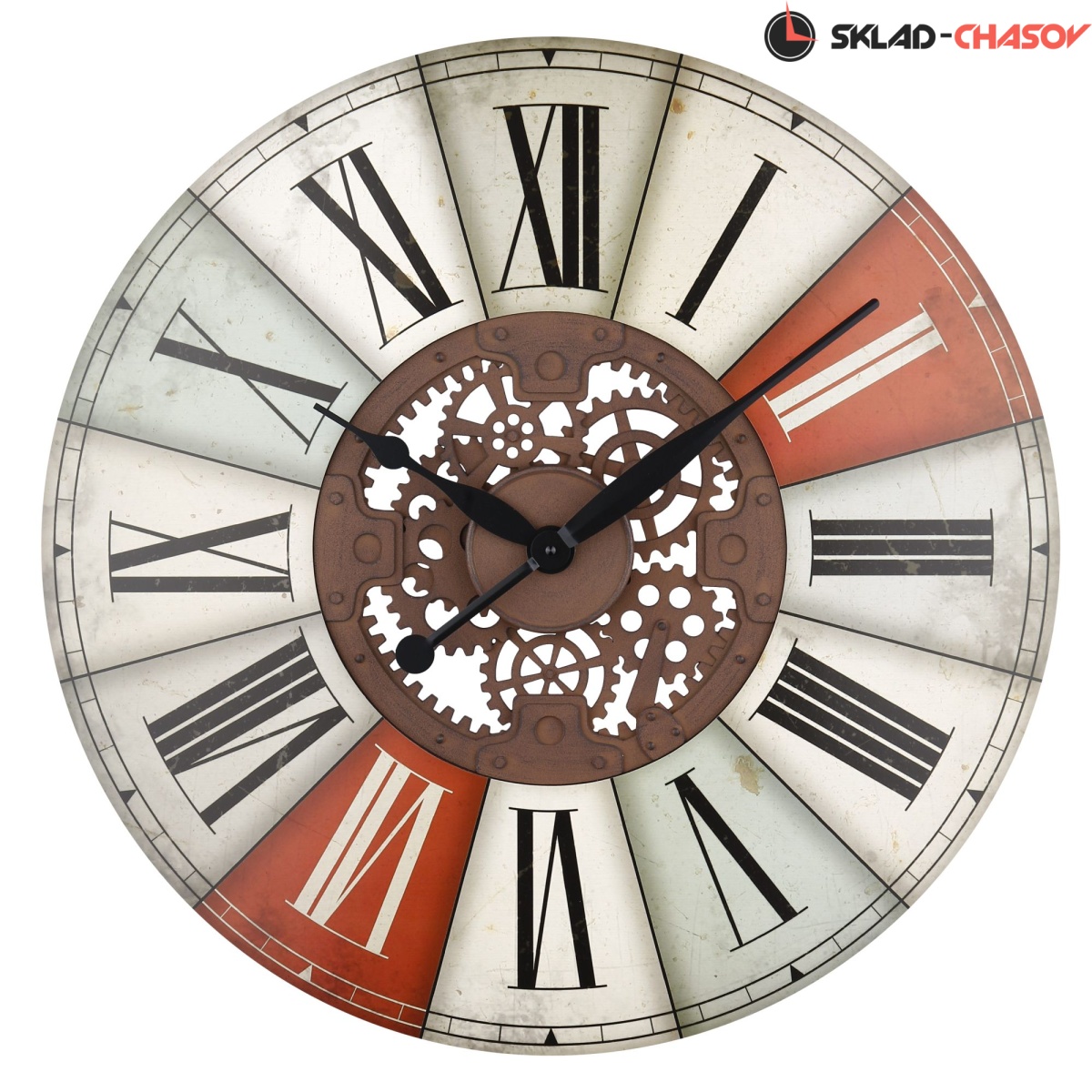 Кварцевые настенные часы с римской оцифровкой. Корпус сделан из МДФ. Объемные шестеренки, в центральной части, отлиты из пластика. Механизм Young Town. Необходим 1 элемент питания типа АА (в комплект не входит).