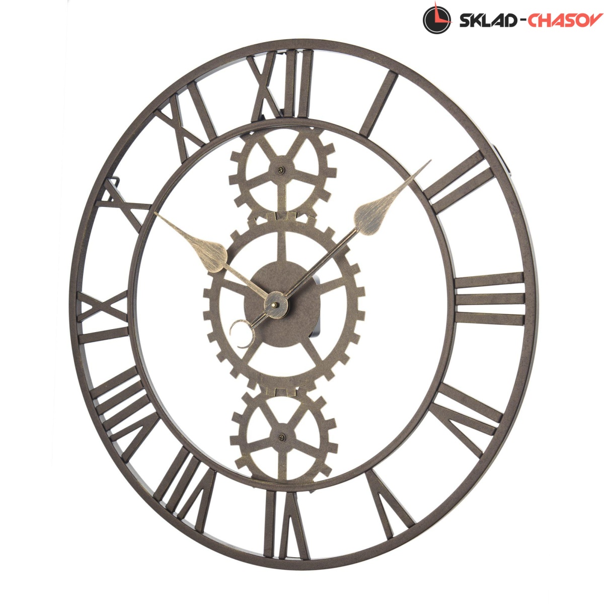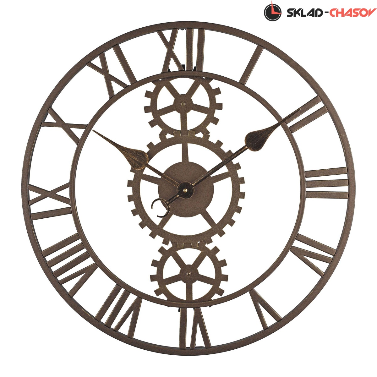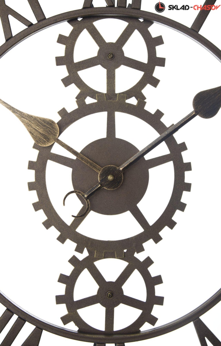 Кварцевые настенные часы. Матовый металлический корпус коричневого цвета с золотой патиной. В центре корпуса размещены 3 стилизованные шестерни. Пикообразные стрелки выполнены в цвете корпуса, но с эффертом браширования. В часах установлен тихий, точный и надежный механизм Young Town 12888 c дискретным ходом. Необходим 1 элемент питания типа АА (в комплект не входит).