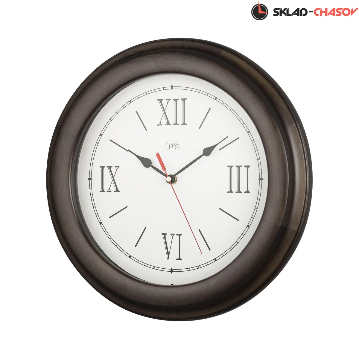 Кварцевые настенные часы. Обод часов выполнен из массива сосны и тонирован в темно-коричневом цвете. Белый циферблат размечен элегантными римскими цифрами и часовыми индексами черного цвета. Дополняют циферблат изящные черные стрелки пикообразной формы и контрастная красная секундная стрелка. Циферблат и стрелки закрыты стеклом. В часах установлен абсолютно бесшумный, точный и надежный механизм Young Town 12888 c плавным ходом. Необходим 1 элемент питания типа АА (в комплект не входит).