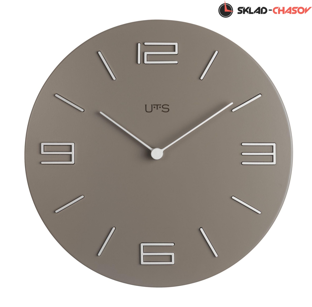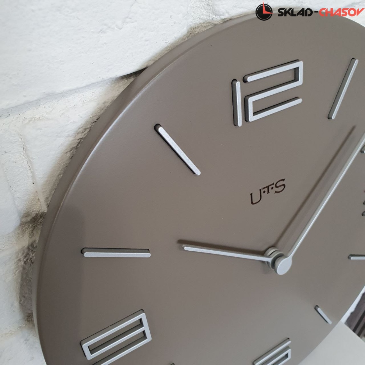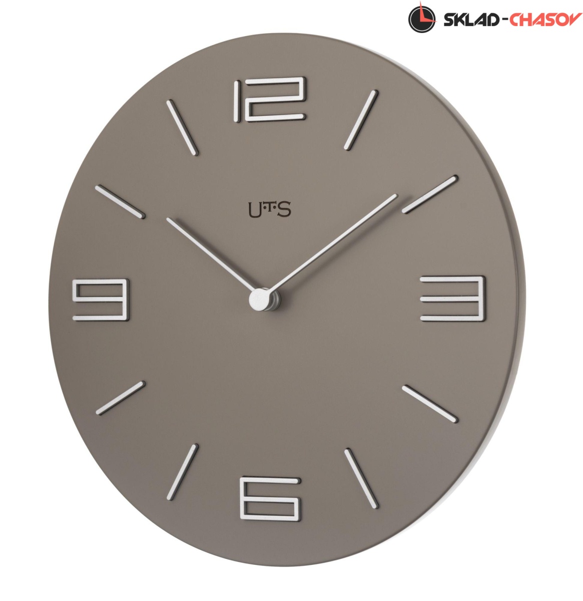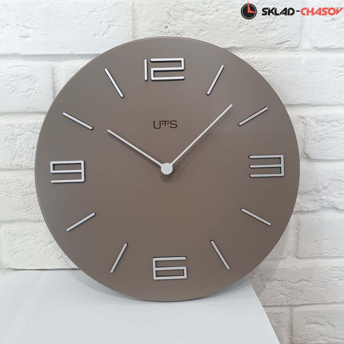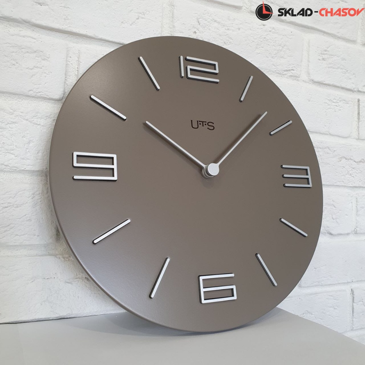 Кварцевые настенные часы. Корпус выполнен из МДФ и покрыт эмалью серо-коричневого цвета. Объемные часовые индексы сделаны из пластика серебристого цвета и аккуратно утоплены в специальных ложементах. В часах установлен тихий, точный и надежный механизм Young Town 12888 c дискретным ходом. Необходим 1 элемент питания типа АА (в комплект не входит).