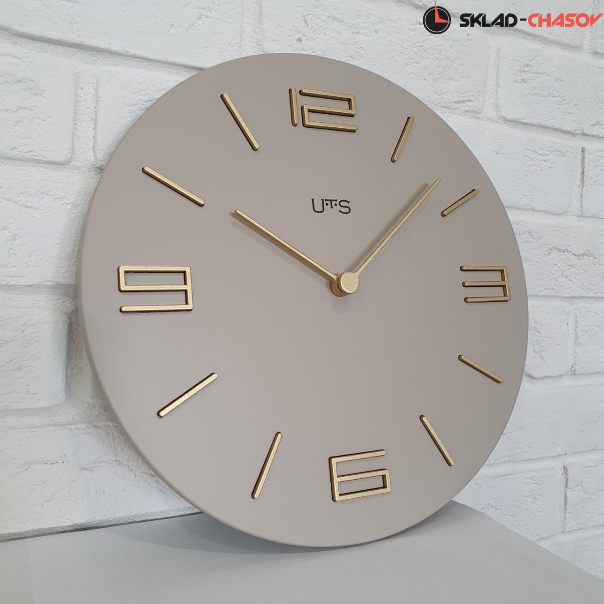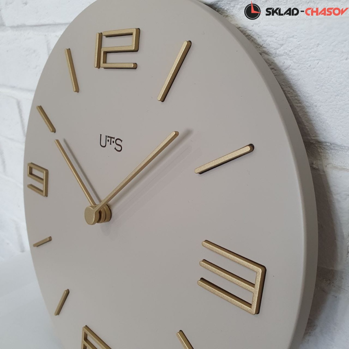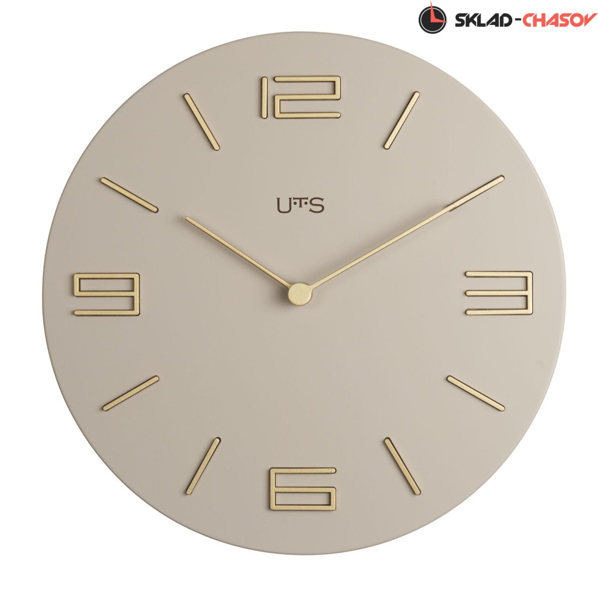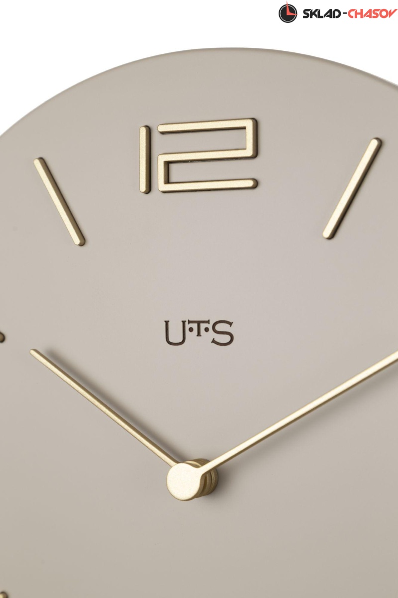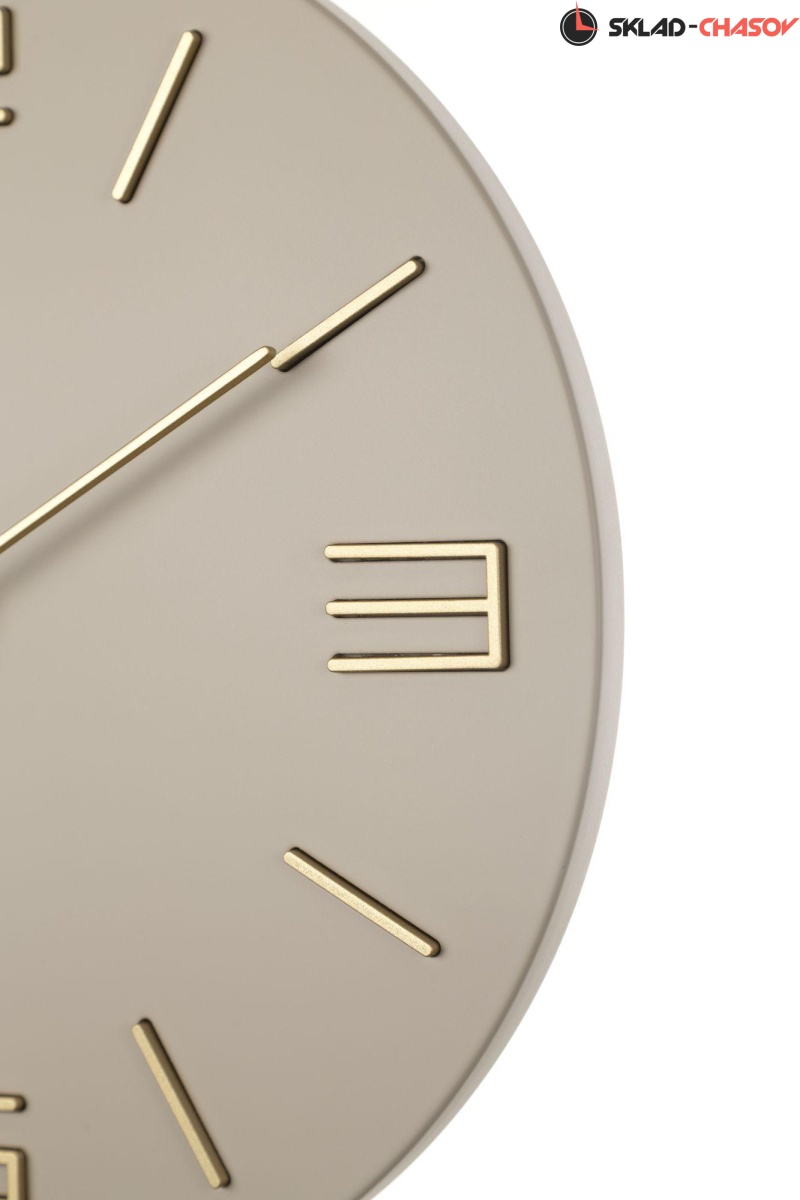 Кварцевые настенные часы. Корпус выполнен из МДФ и покрыт эмалью серо-бежевого цвета. Объемные часовые индексы сделаны из пластика золотого цвета и аккуратно утоплены в специальных ложементах. В часах установлен тихий, точный и надежный механизм Young Town 12888 c дискретным ходом. Необходим 1 элемент питания типа АА (в комплект не входит).