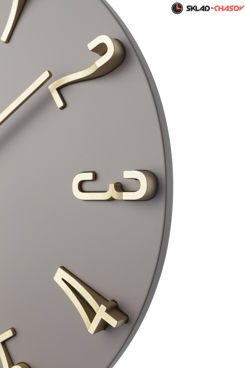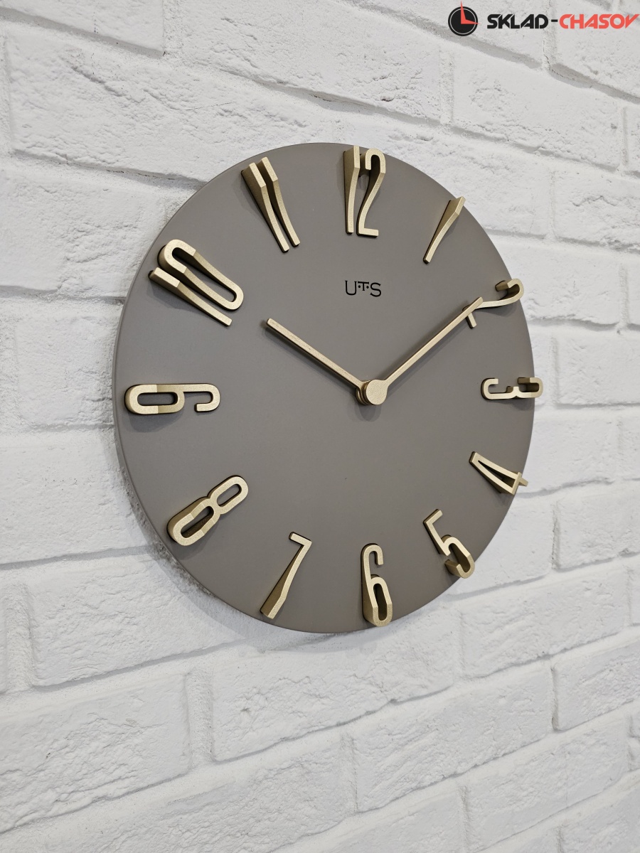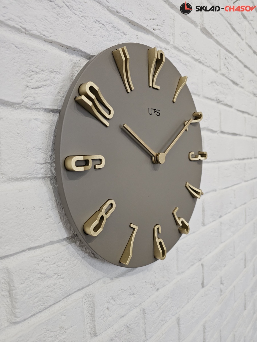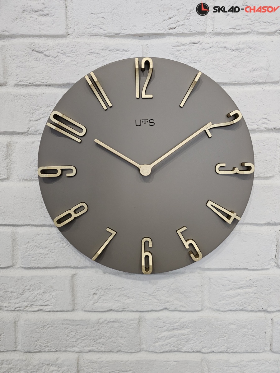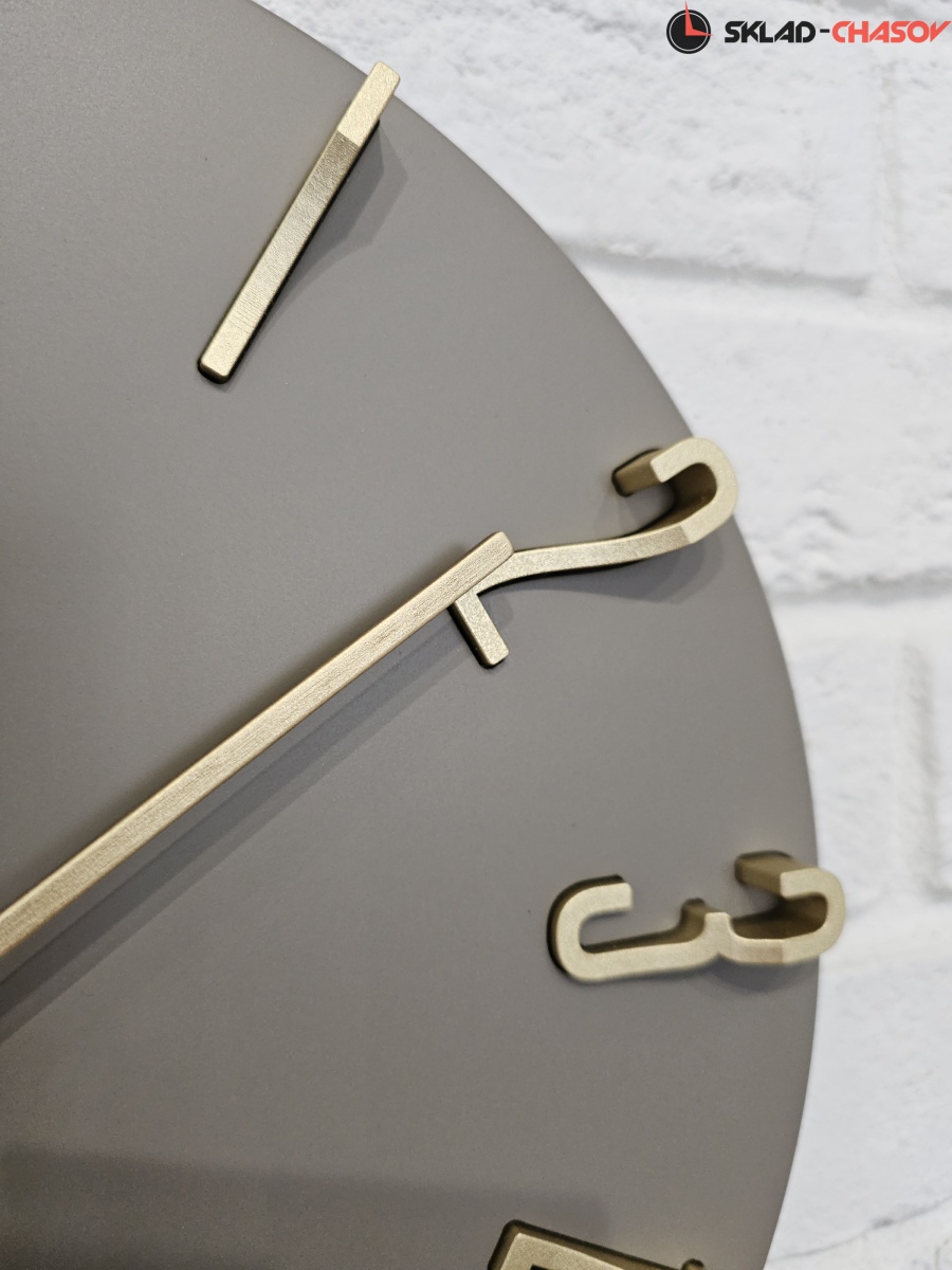 Кварцевые настенные часы с современном стиле. Корпус выполнен из МДФ и тонирован в серо-коричневом цвете. Объемные арабские цифры сделаны из пластика золотого цвета и аккуратно утоплены в специальных ложементах. В часах установлен тихий, точный и надежный механизм Young Town 12888 c дискретным ходом. Необходим 1 элемент питания типа АА (в комплект не входит).