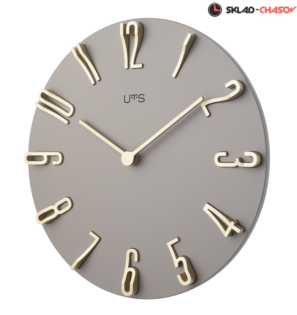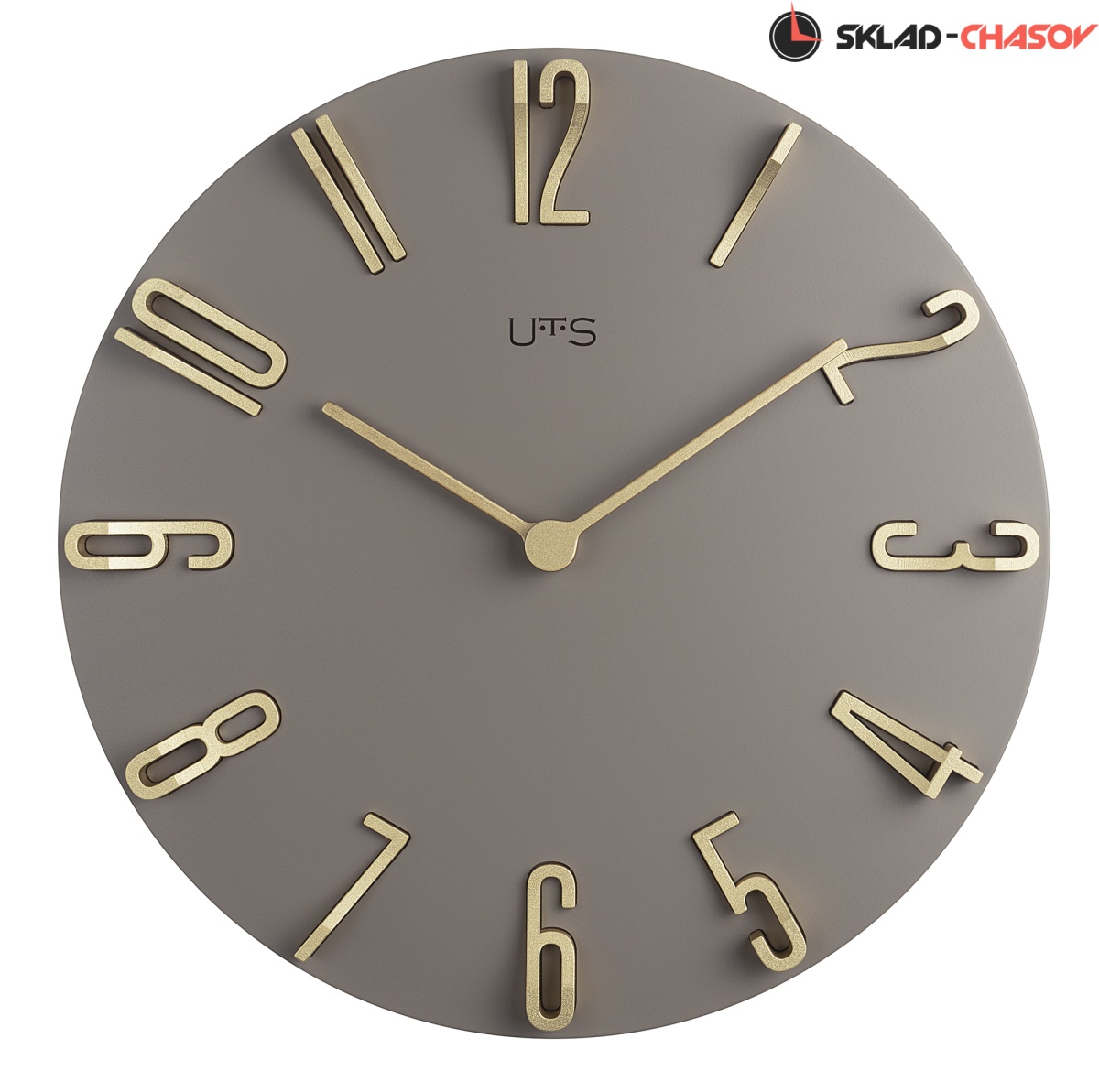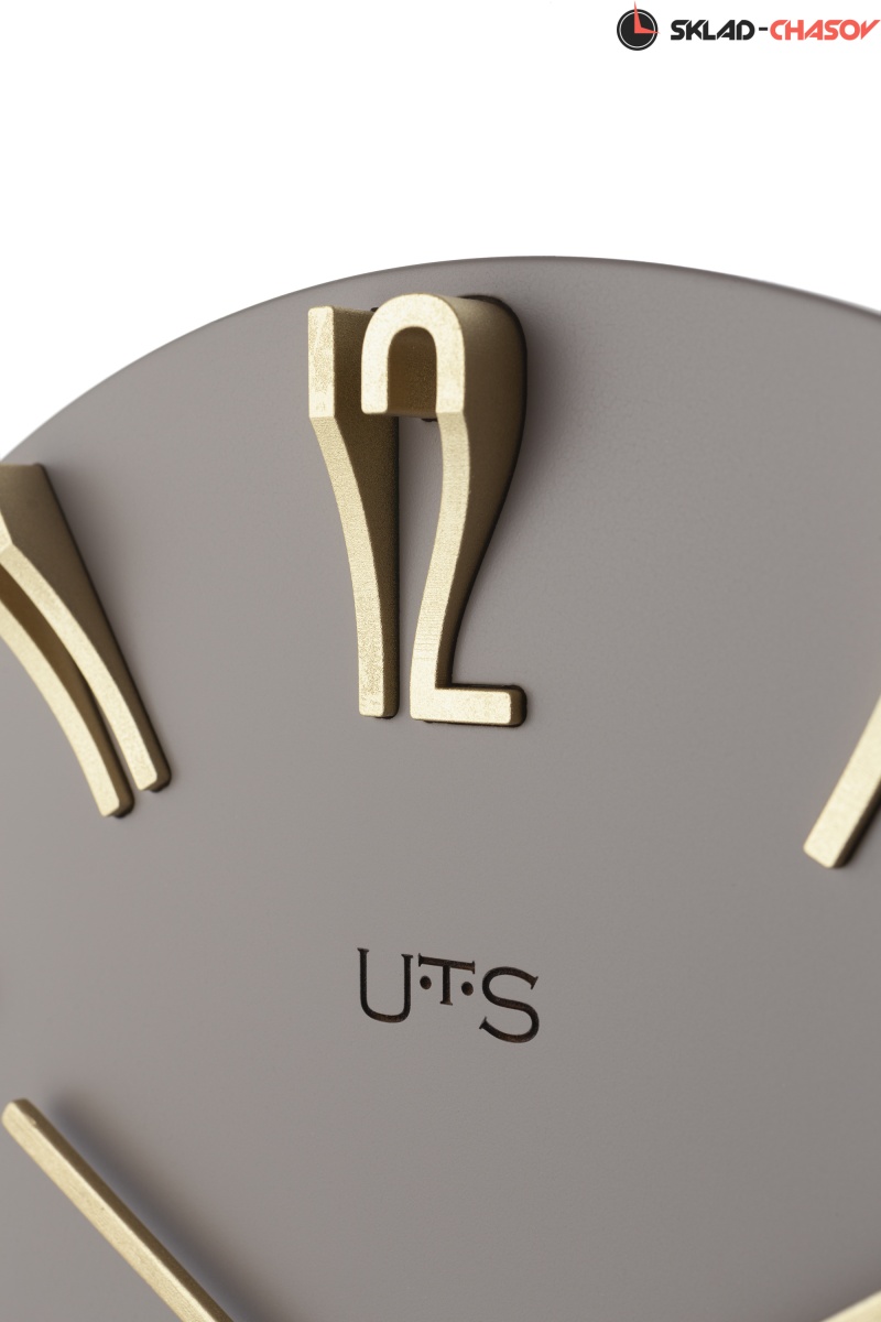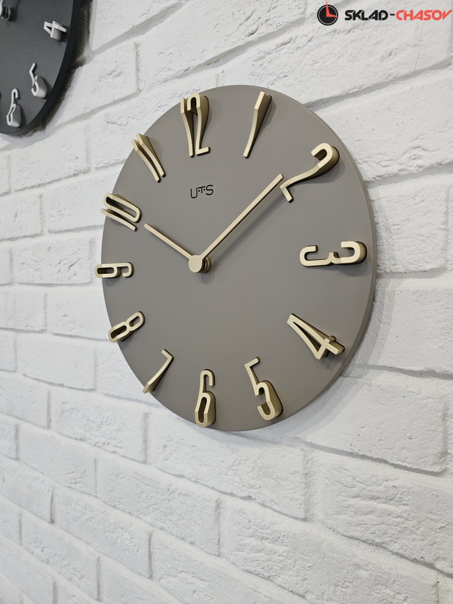 Кварцевые настенные часы с современном стиле. Корпус выполнен из МДФ и тонирован в серо-коричневом цвете. Объемные арабские цифры сделаны из пластика золотого цвета и аккуратно утоплены в специальных ложементах. В часах установлен тихий, точный и надежный механизм Young Town 12888 c дискретным ходом. Необходим 1 элемент питания типа АА (в комплект не входит).